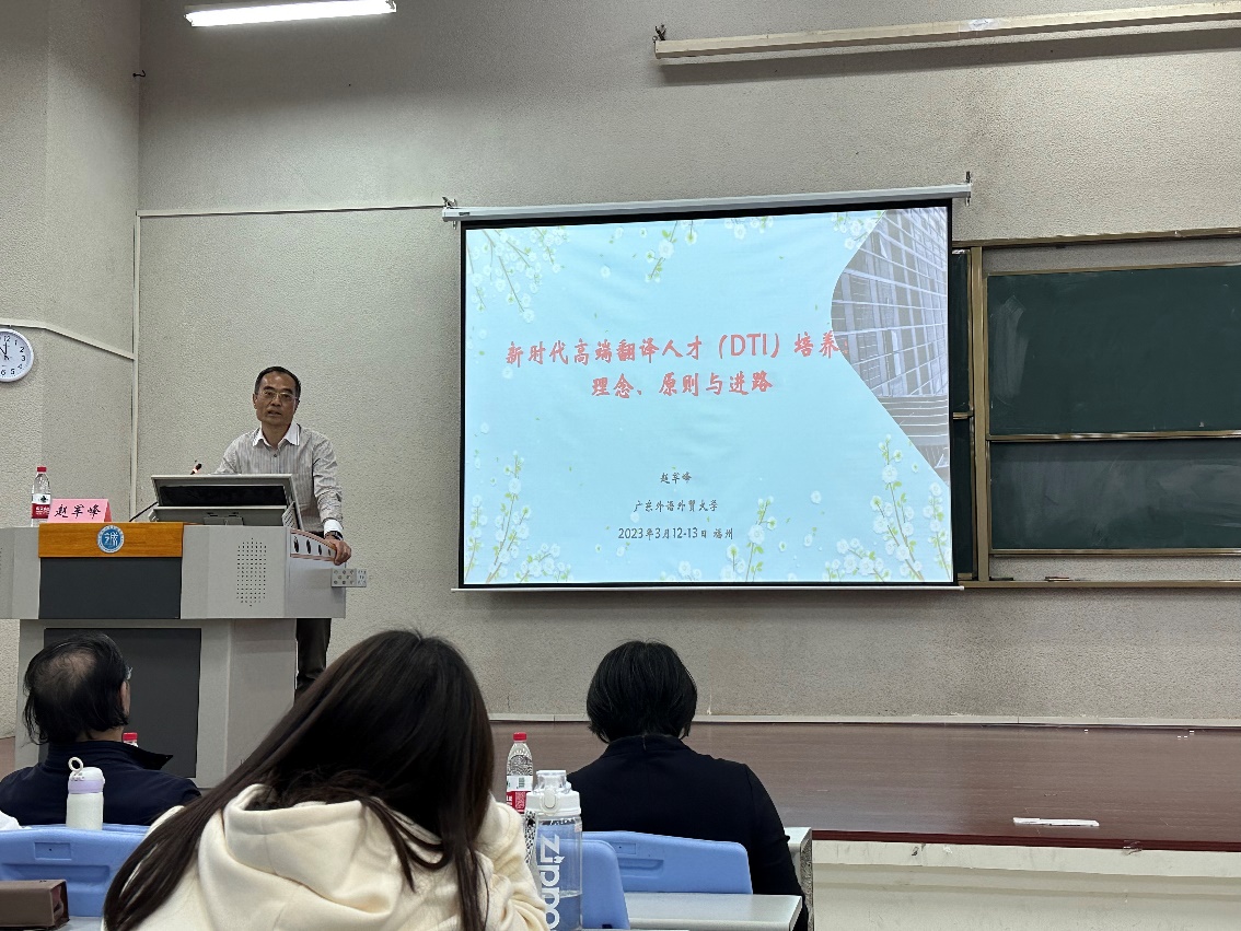 3月12日下午,广东外语外贸大学赵军峰教授担任学院琴南讲坛嘉宾,讲座题为《新时代高端翻译人才培养与博士专业学位(DTI)教育:理念、原则和进路》。本次讲座在铜盘科报厅A举行,百余名师生参加讲座。讲座由林继红副院长主持。