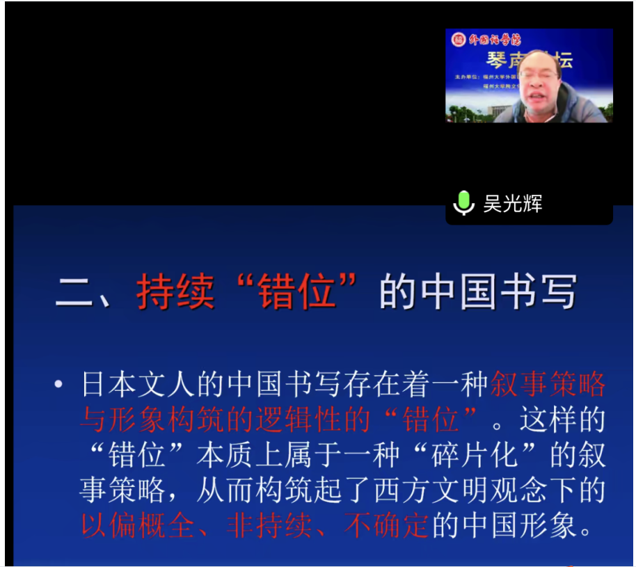 12月16日上午,厦门大学吴光辉教授在线担任Av在线观看 琴南讲坛嘉宾,讲座题目为《“发现”还是“确认”—以近代日本文人的中国形象构筑为批判对象》。讲座由陈晓隽博士主持。在线参会师生人数达到了近100人。