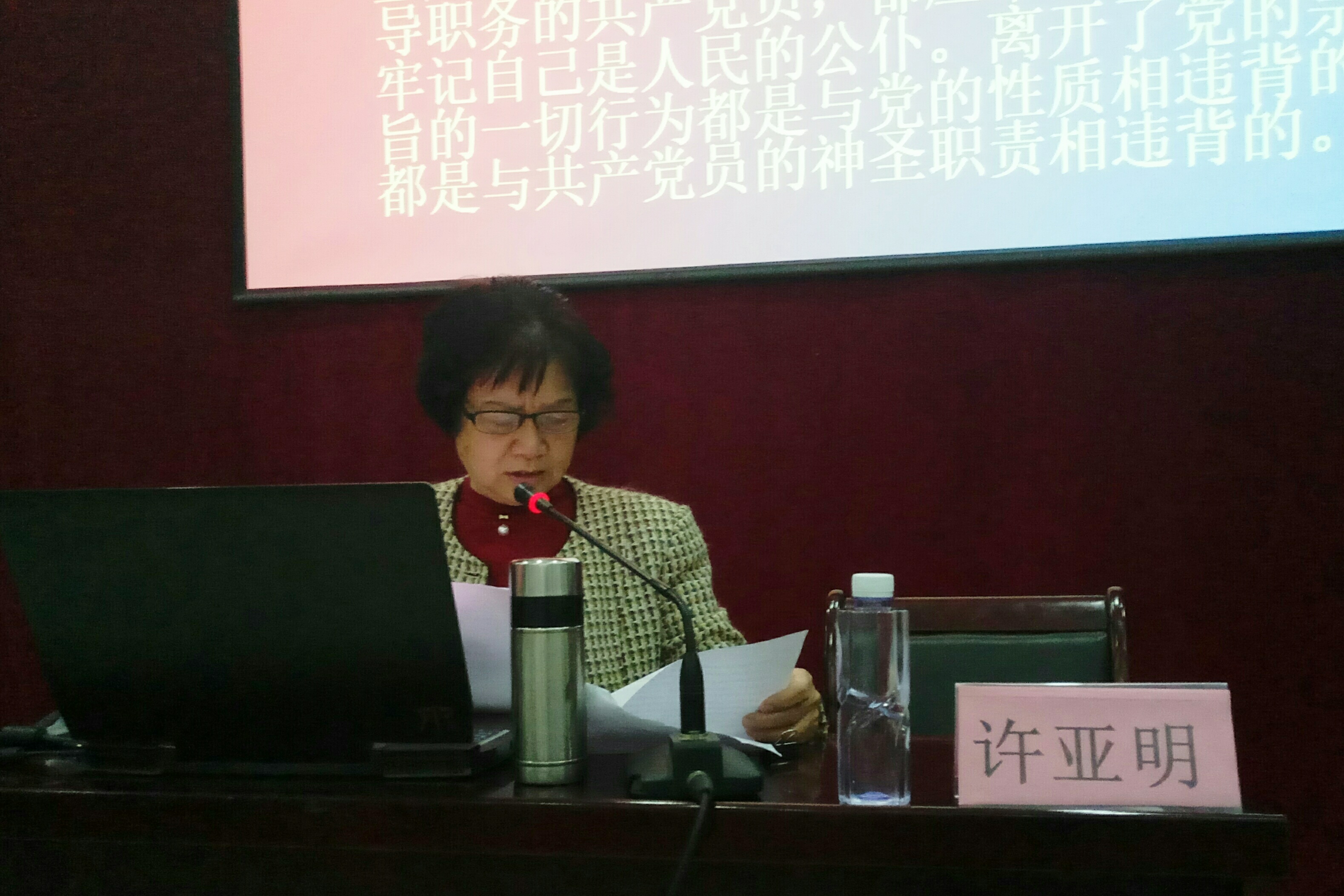 关工委许亚明教授主讲。课上,许教授围绕“牢记党的宗旨,不忘初心跟党走”的主题,分别从 “什么是党的宗旨”、“为人民服务必须坚持的原则”、“必须提高为人民服务的本领”三个方面进行充分阐述,铿锵有力的话语直击人心,强调作为一名合格的党员应该遵守的原则。作为一名有着46年党龄的老党员,回顾起党对自己的培养,许教授心潮澎湃。她以自己的亲身经历,教导在场入党积极分子:以实际行动践行“为人民服务”的宗旨。