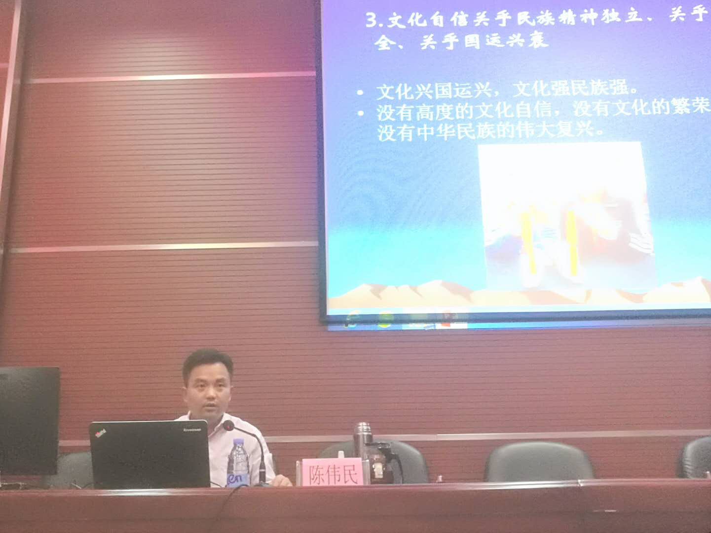 课上,陈伟民书记从坚定文化自信的必要性说起,他指出,文化自信是制度、道路、理论自信的精神基础,是我国推进建设中国特色社会主义的精神力量,对于民族和国家的进步具有重要意义。随后,他从习近平总书记谈文化自信、为什么要谈文化自信、新时代文化自信的基本内容、新时代青年如何增强文化自信四个方面进行了深入地阐述,既有理论高度,又有生动事例,深入浅出。
