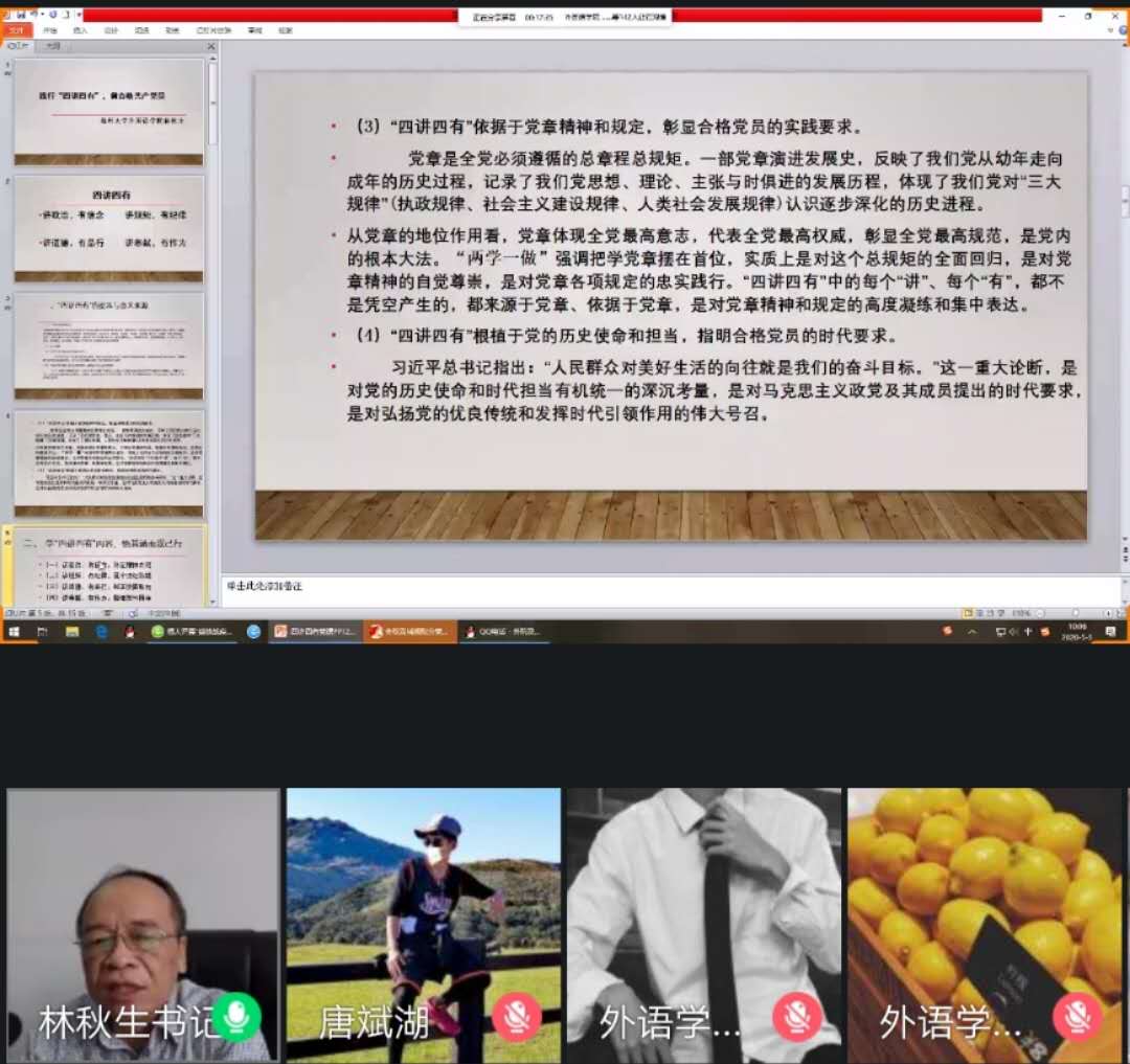 第20期分党校与建筑城规院第21期分党校第一次联合党课通过线上视频会议顺利举行。外国语学院党委林秋生书记为同学们做《做四有好党员》的主题培训。