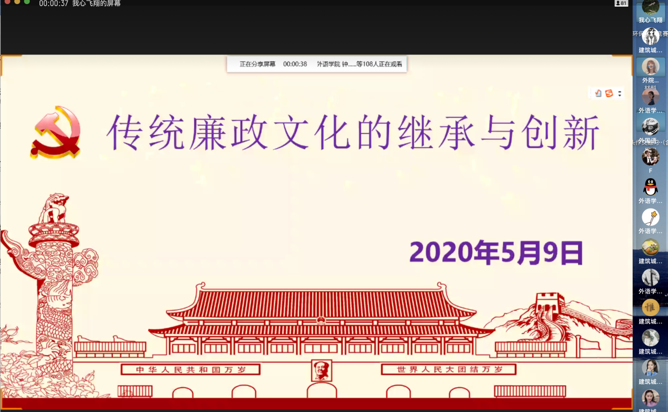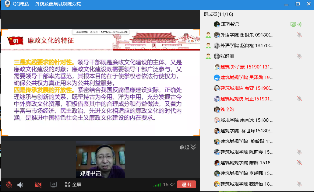 分党校第20期暨建筑城规院分党校第21期入党积极分子培训班第三次联合党课通过线上视频会议举行。建筑城规院郑翔书记以“传统廉政文化的继承与创新”为主题,为同学们做主题培训。