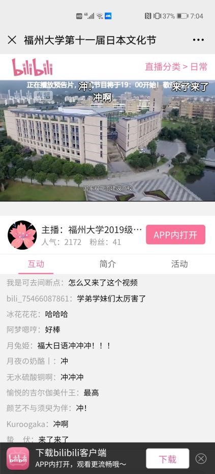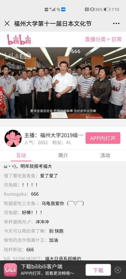 外国语学院的传统,在疫情防控常态化的背景下,此次“中日文化交流展”对以往文化节的展现形式进行创新,首次决定并采用线上汇报的形式,在bilibili平台进行直播汇报。直播过程中,观看人数不断增多,最高观看人数达4800余人。观众们用弹幕的方式对本次“中日文化交流展”表示高度的赞美与欣赏,最后,以在线抽奖的方式选出幸运观众,送上19级日语系精心准备的奖品。