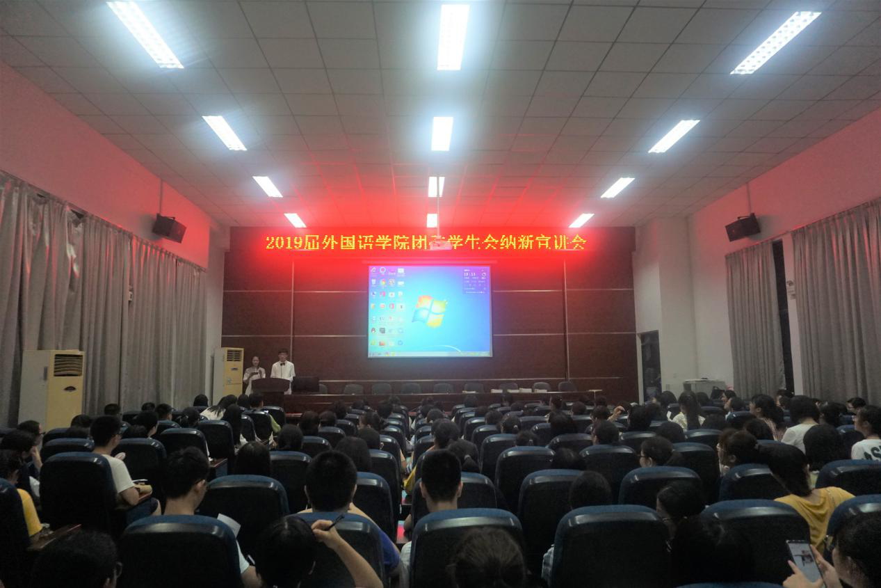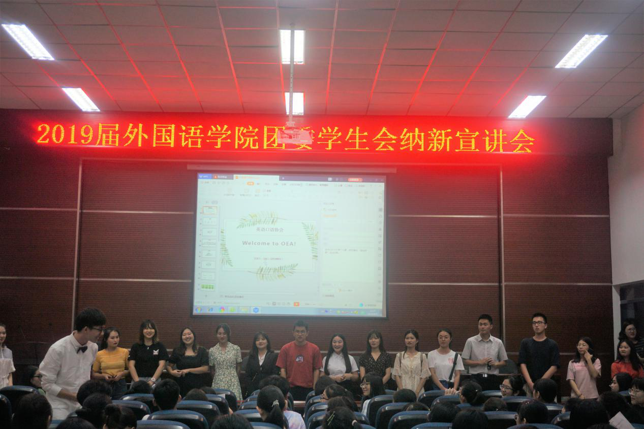 9月7日晚上2019级全体外院新生在新生班导、辅助及各社团负责人的带领下,在外院成功举办了2019级外国语学院团委学生会纳新宣讲会。
