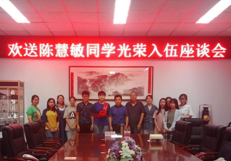 欢送陈慧敏同学光荣入伍座谈会在院办208会议室召开。院党委陈伟民书记、78年入伍的退伍军人赖斌老师、辅导员唐斌湖老师、陈慧敏同学及17级班委参加。座谈会由唐斌湖老师主持。