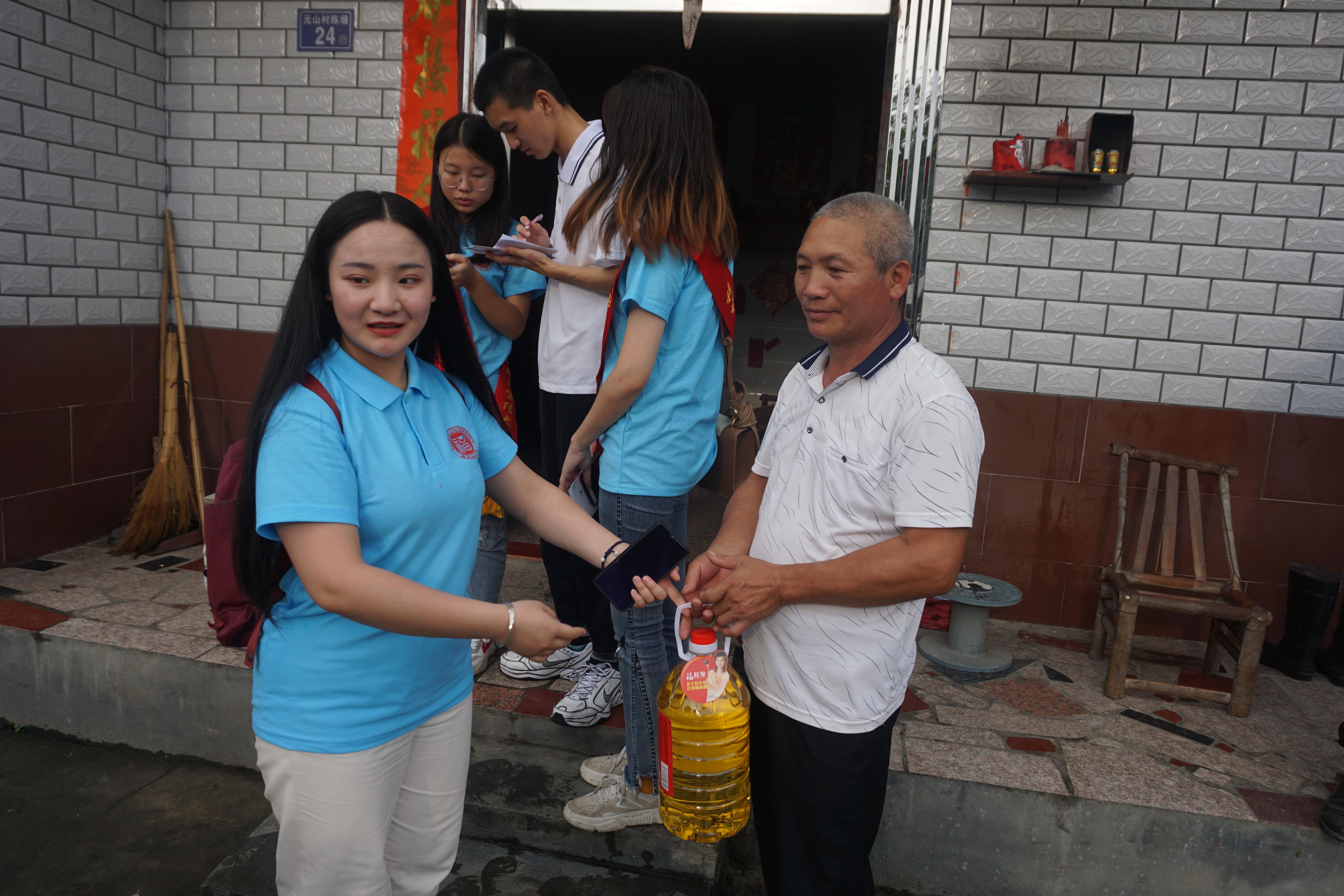 宣传队的同学们还为这户家庭带来了米和油,为他们送上力所能及的温暖与帮助,受访家庭也深受感动。此外,实践队员宣传队同学为这位学生分发了全国学生资助政策手册和大学生生源地助学贷款等资助宣传材料,并耐心讲解了手册中的高校学生资助政策体系以及高校期间多样的受资助渠道,从而打消家庭经济困难学生“上不起学”的顾虑。他表示,在了解完相关政策之后,感到十分开心,觉得父母身上的担子像是轻了一点。同时这也激励他们更加努力奋斗,进一步深化诚信、励志、感恩教育。