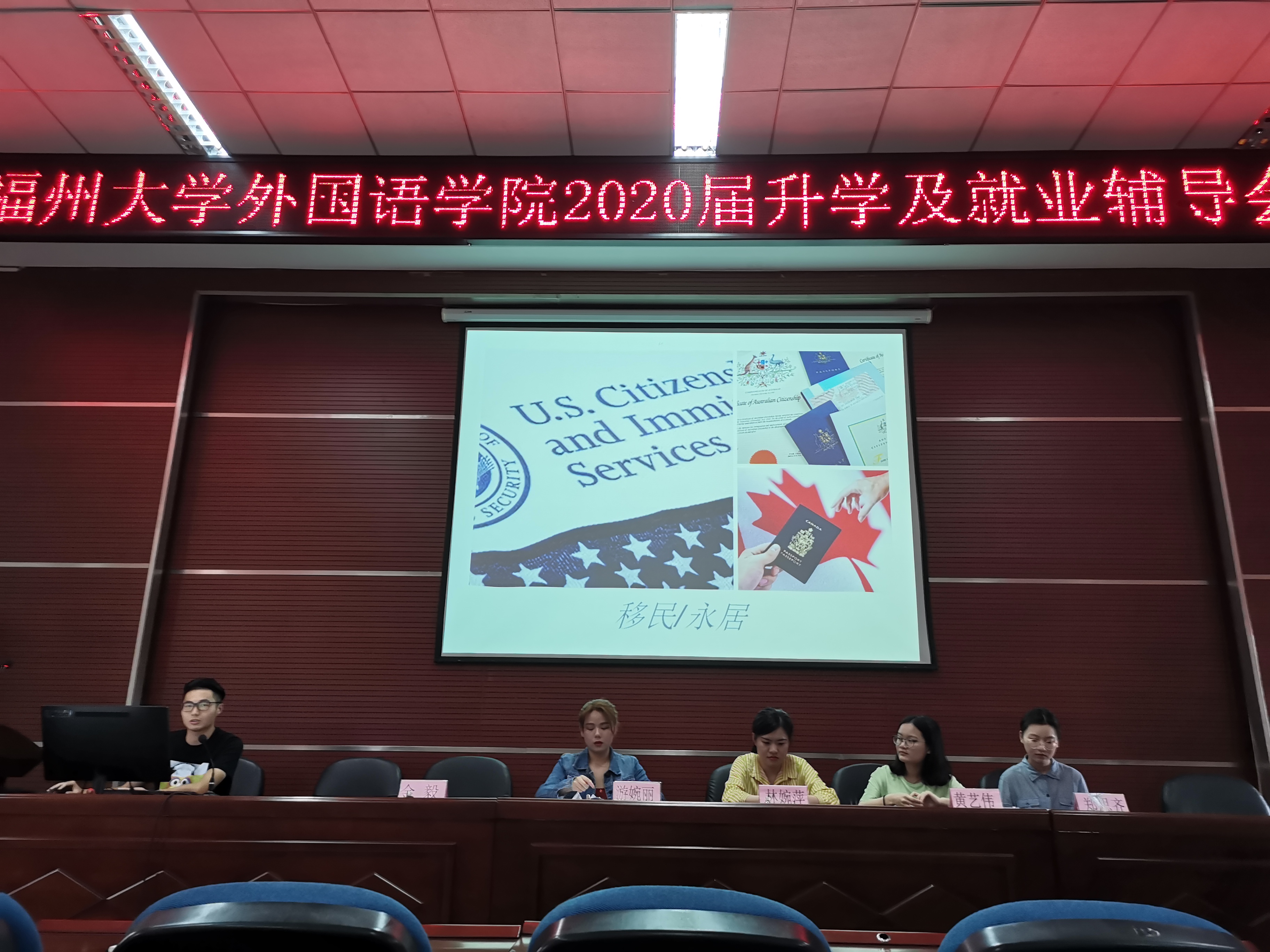 升学及就业优秀学生代表郑思齐、金毅、林婉萍、黄艺伟、游婉萍为2020届学子介绍相关信息。