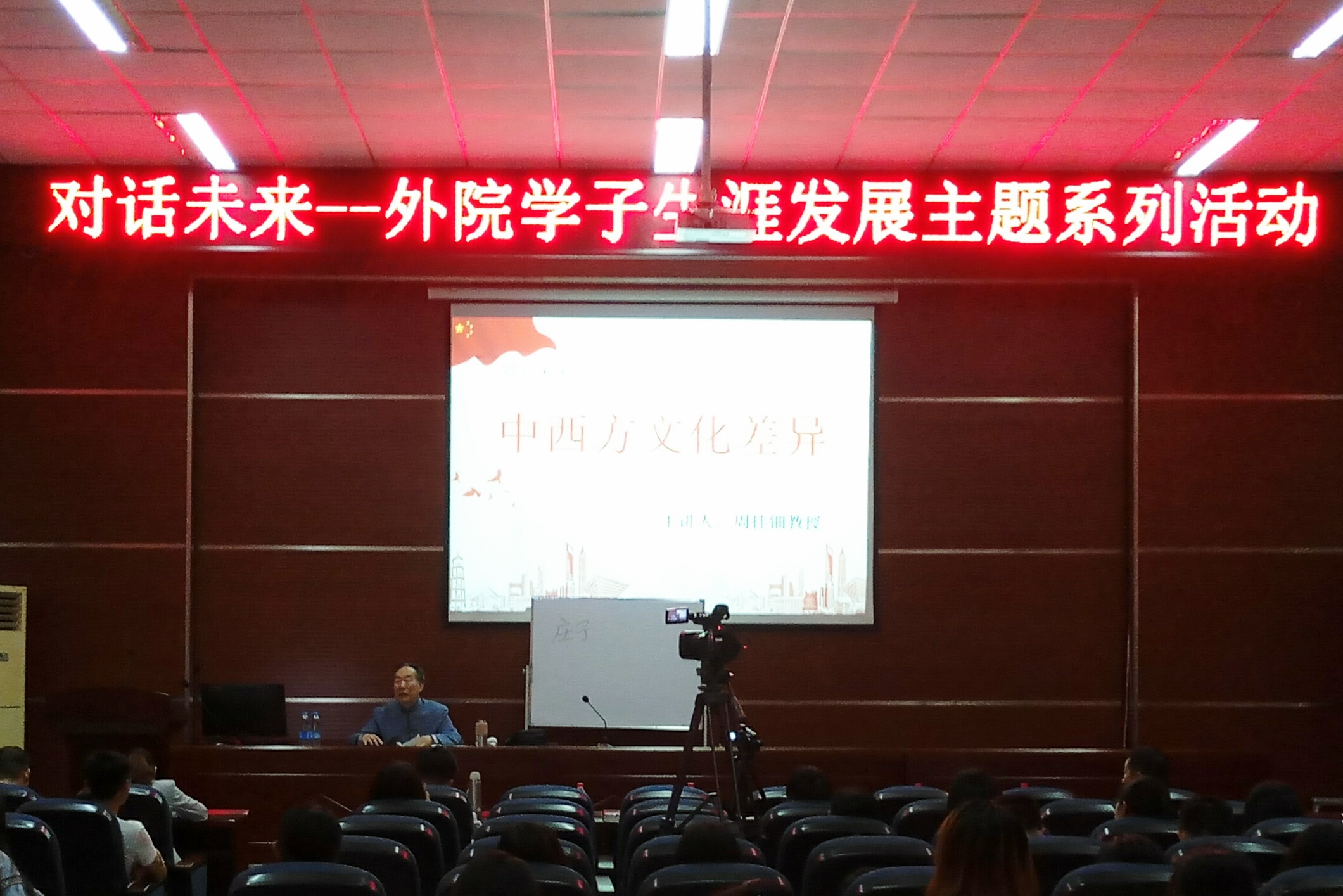 4月2日晚,对话未来--外院学子生涯发展主题系列活动第二场讲座--“中西方文化差异”在院办三楼会议室开展。本次讲座由北京师范大学教授、中国政法大学国际儒学院副院长、日本京都大学客座教授周桂钿教授主讲。出席本次讲座的嘉宾有外国语学院党委书记陈伟民、外国语学院党委副书记王三强、辅导员唐斌湖老师以及78级采矿校友周爱民先生,外院16级德语专业学生和全体17级学生参加。