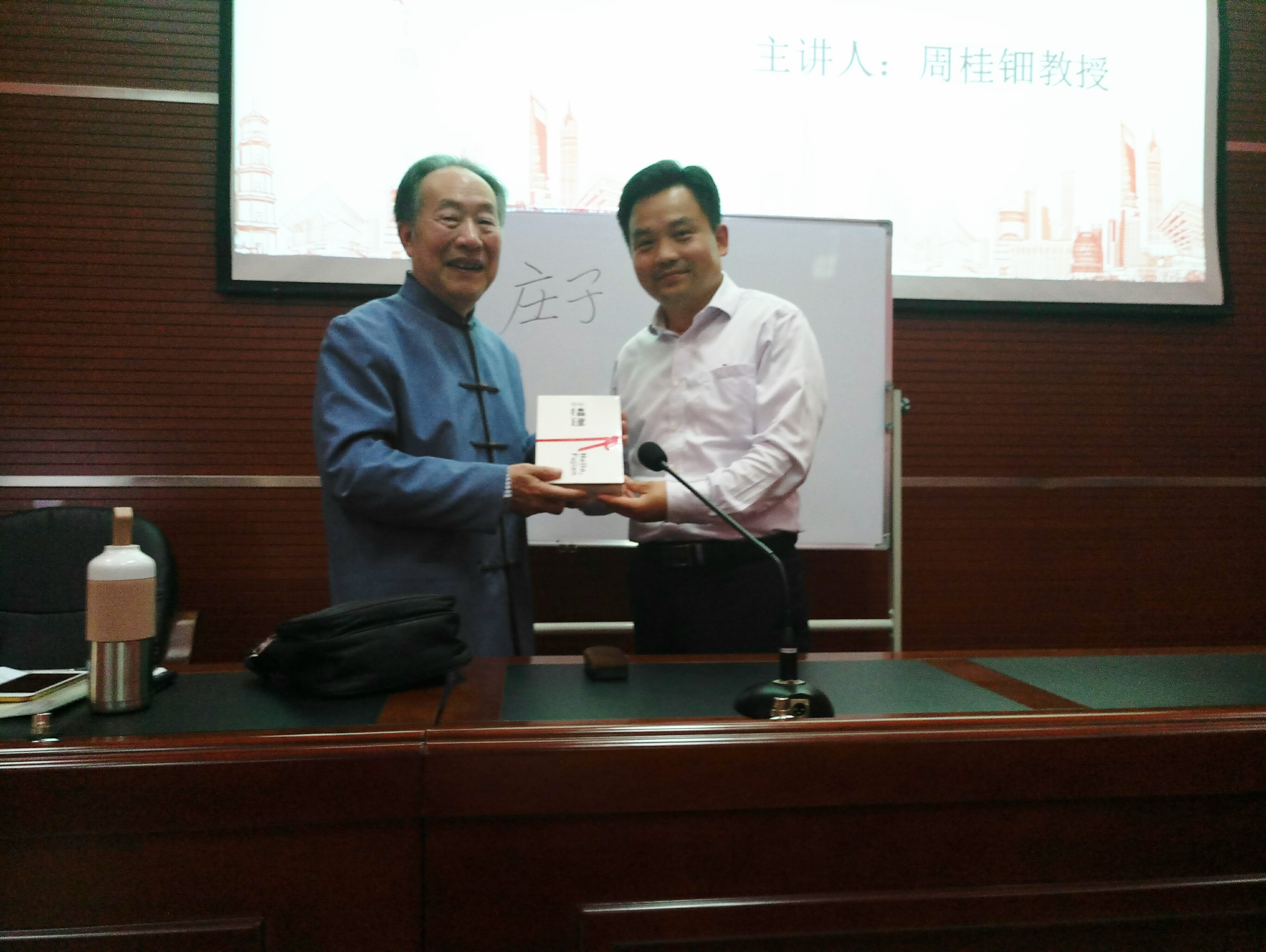 讲座开篇,周教授提出:“有人的地方就有文化,譬如长江文化、泰山文化等等,因此文化得以源远流长。”然后谈到,中西方在交往过程中的差异,如西方推崇等价交换,中国崇尚礼尚往来。而后周教授更是大篇幅侃谈中国传统文化,从古代社会制度、人物等方面详尽阐述他的独到见解。讲座尾声,到场同学提出自己的问题,周教授都一一详细耐心解答,收获掌声一片。最后,周教授赠予外院其自撰书籍--《十五堂哲学课》以纪念此行,而后陈伟民书记代表外院回赠周教授由外院教师主编书籍《你好,福建》,到此讲座划上圆满句号。