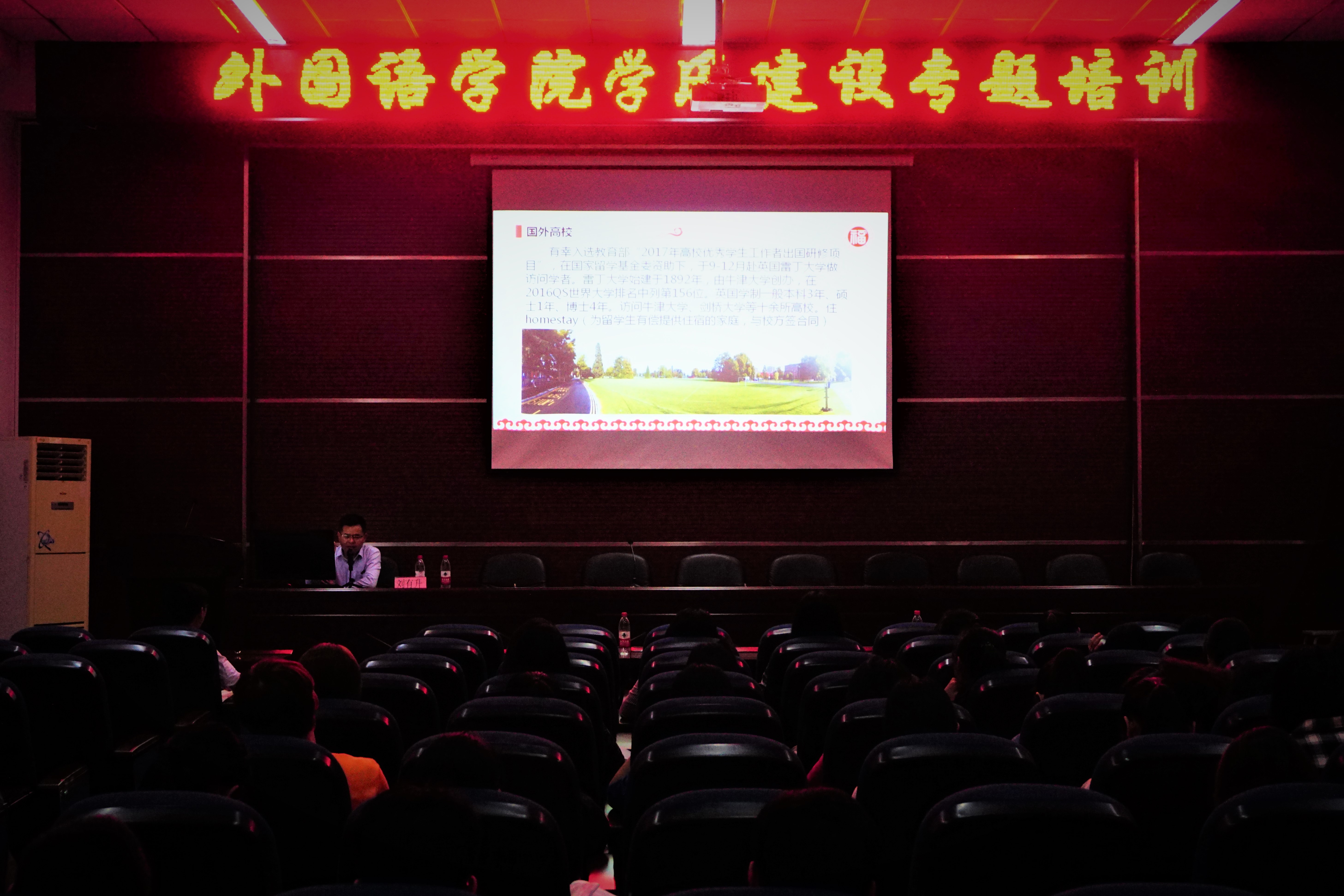 4月11日晚,外国语学院学风建设专题培训在外国语学院楼三楼报告厅举行。由学生处刘有升老师主讲“培育优良学风,争做新时代优秀学子”学风建设专题培训。外国语学院辅导员唐斌湖老师到场主持,外国语学院本科党员、预备党员、发展对象、学生会部长(及以上)、党建负责人、各年段段长、辅导员助理、班长、支书、副班长和舍长到场学习。