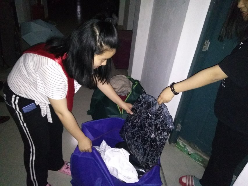 红十字会带领全体大一部员于2018年4月27日晚九点四十五分在13号楼进行本月的旧衣物回收活动。