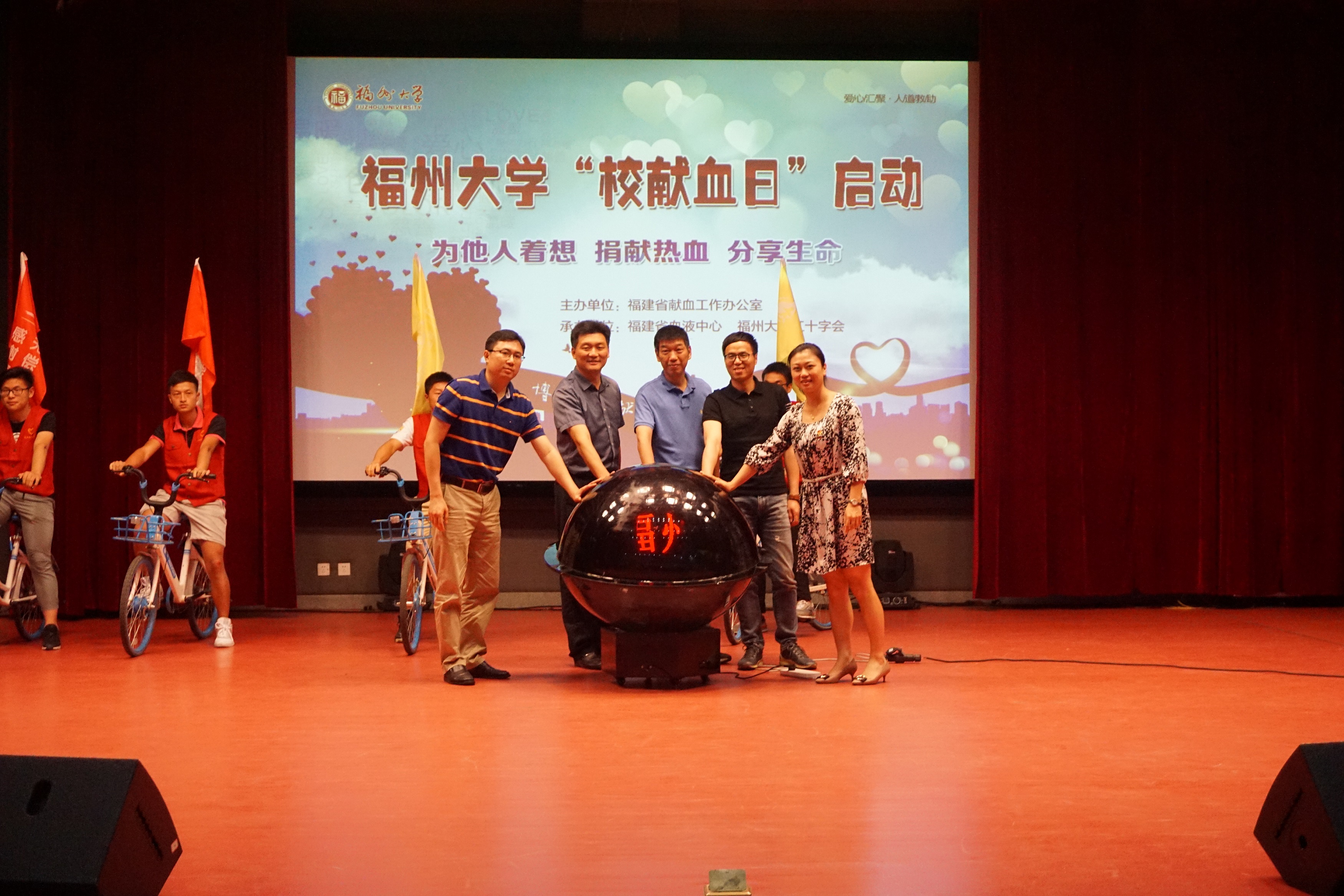 无偿献血工作表示极大肯定。最后,由到场的五位领导嘉宾共同上台开启校献血日启动球,宣布校献血日的正式启动。
