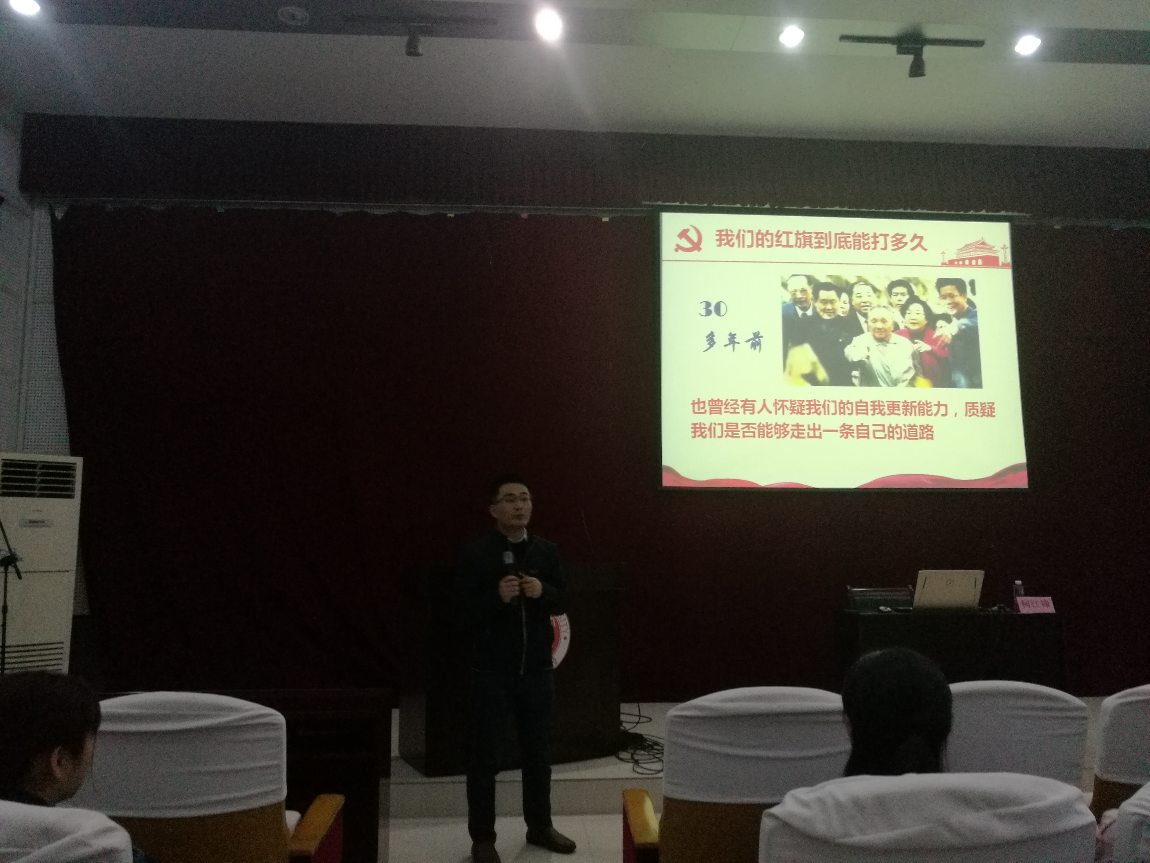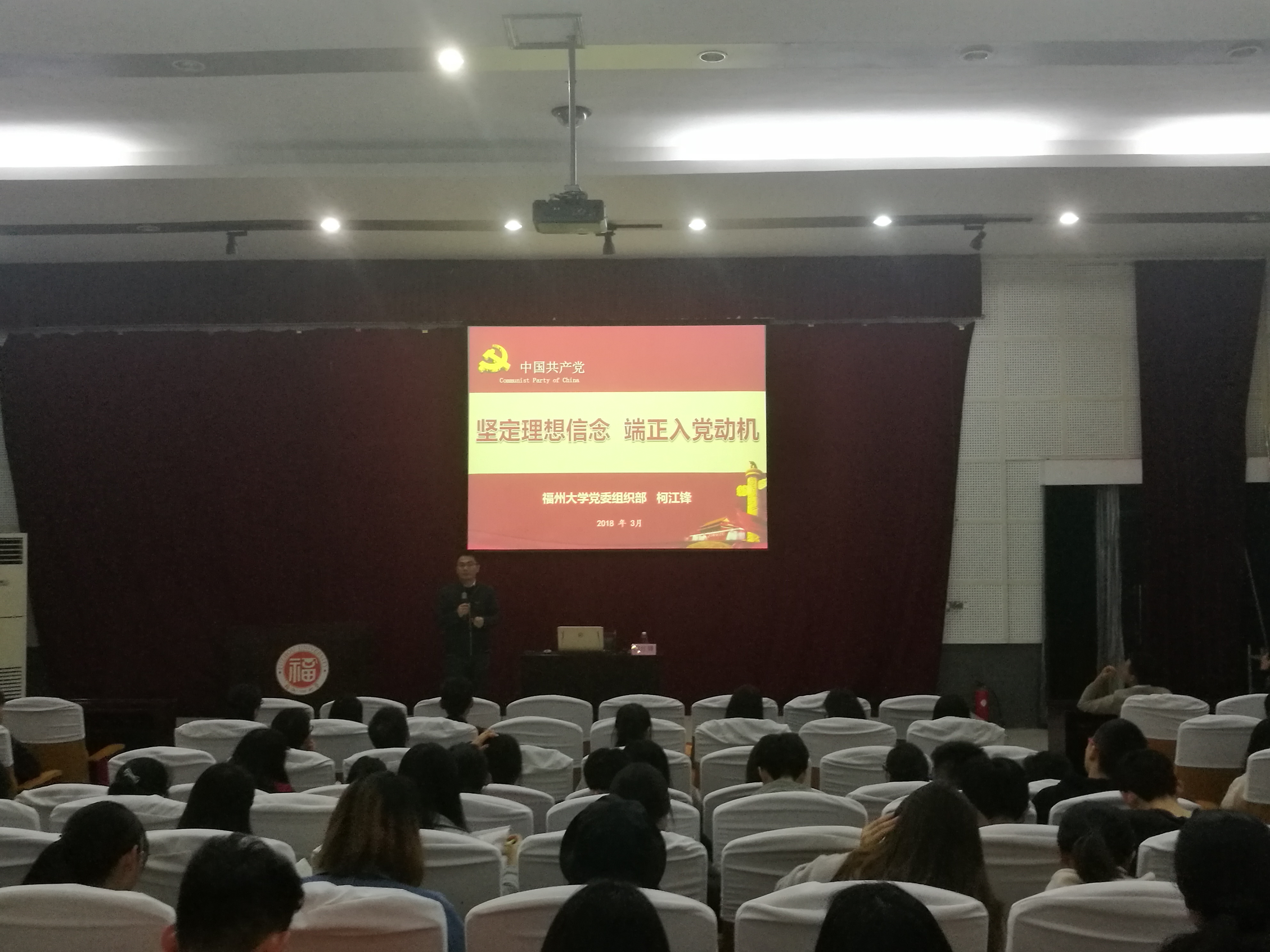 党委组织部柯江峰老师主讲,出席此次党课的还有外国语学院辅导员唐斌湖老师与建筑学院辅导员张静丽老师。本次课程主要面向外国语学院和建筑学院的各年级入党积极分子开展。