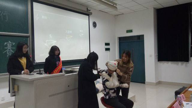 红十字会与校红十字先后对急救大赛队伍进行两次急救技能培训。这两次培训中,校红十字会的培训人员强调了急救的重要性,讲解了一些实用的急救知识,并分步骤细节化地向各个队伍展示指导了急救包扎和心肺复苏等项目的正确手法。同学们在活动现场反复练习,还积极提问。更有同学拍下了照片或视频,以便复习。