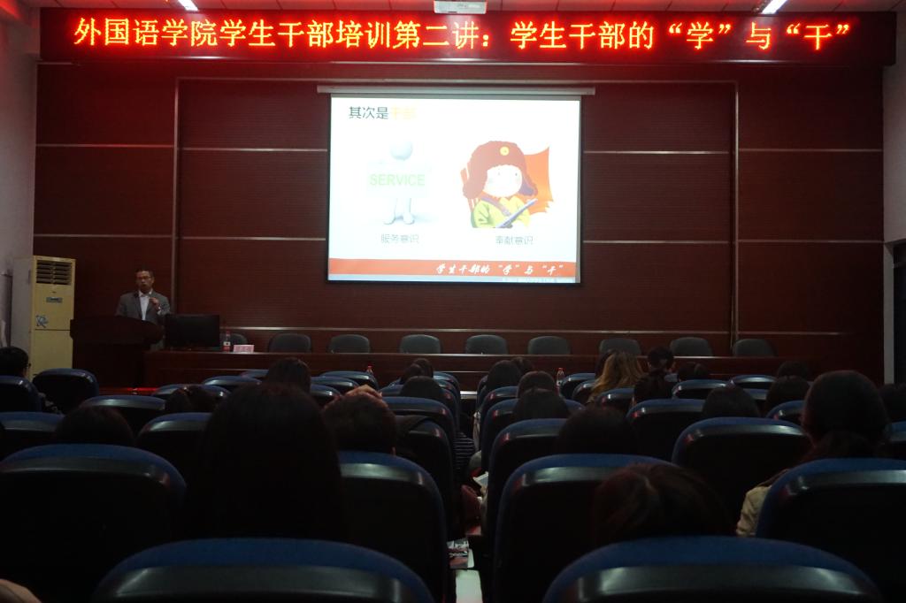 12月4日晚六点二十分,外国语学院学生干部培训第二讲在学院三楼会议室顺利开展。讲座邀请到了岳志强老师作主讲人。外国语学院党委书记(主持)陈伟民老师,辅导员刘燕老师、唐斌湖老师、林昕老师出席,全体学生干部共同参与。