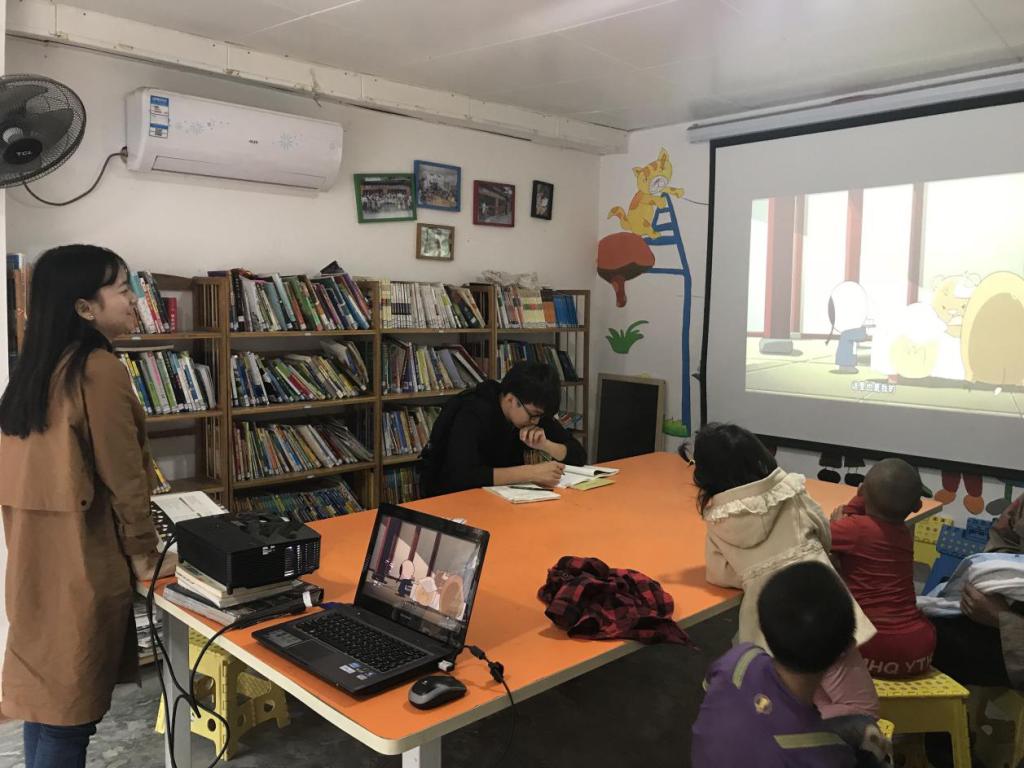 下午两点五十,支教志愿者开始授课。志愿者们先给孩子们放映了有趣的动画片,让他们在有趣的氛围中学习外语。接着,志愿者们又和孩子们一起玩游戏,在欢声笑语中增进了彼此的感情。小朋友们在和志愿者们的互动中渐渐活跃起来,现场气氛非常融洽。趣味外语课程帮助小朋友们在快乐中学习英语,在游戏中获得知识。