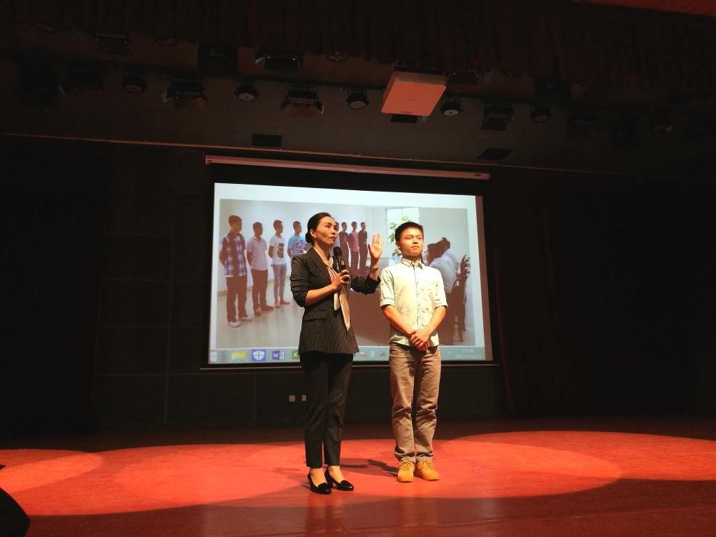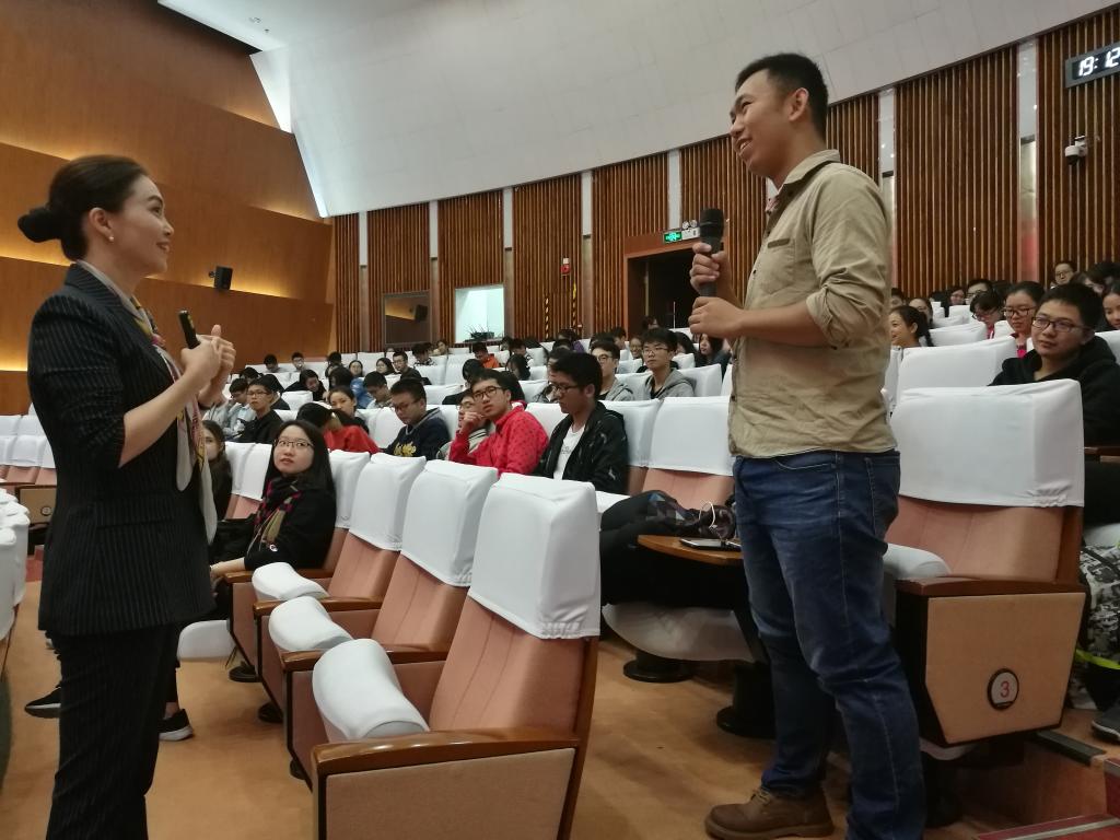 在讲座正式开始前,朱玉华老师让在座学生与右边的同学握手,让他们用眼睛认真观察对方,并给予微笑,由此强调毕业生求职面试中最关键的两个要素:专注的眼神和灿烂的笑容。随后,讲座在同学们的掌声与笑声中拉开了帷幕。