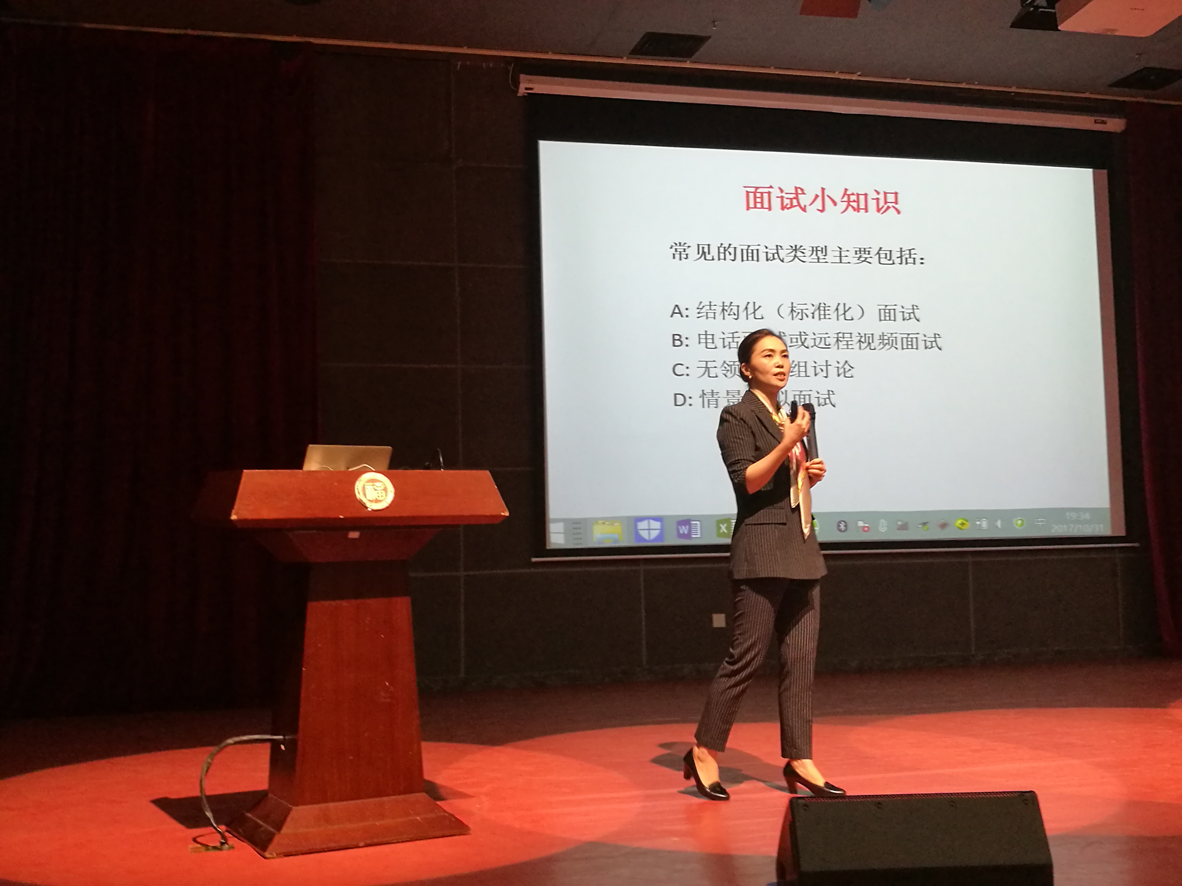 朱玉华老师将面试礼仪按时间分为面试前、面试中、面试后三个部分。她强调面试前要先了解招聘企业的信息,并根据用人单位的要求调整个人简历的细节,要注重个人形象。她还与在座学生进行互动,邀请同学上台演示最标准的面试仪态。此外,朱老师为同学列出了面试现场需注意的十大细节,如提前十五分钟进场、要敲门进入面试室等等,同时提醒毕业生们在求职后注意保持手机畅通,在24小时内回复感谢信等容易被忽略的细节。整场讲座氛围轻松愉快,朱老师诙谐有趣而又干货满满的演讲使同学们在欢笑声中亦感收获甚多。