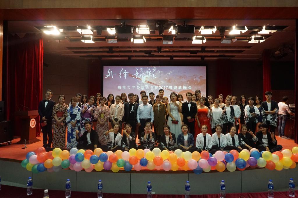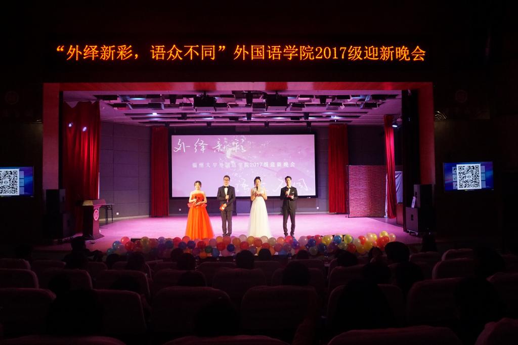 11月1日晚七点,外国语学院在图书馆博学厅举办了主题为“外绎新彩,语众不同”的2017迎新晚会。出席本次晚会的有党委书记(主持)陈伟民老师,德语系王晓霞老师,日语系外教黑冈老师、池泽老师,学院办公室主任庄颖慧老师,学院教学办公室黄柑莲老师,辅导员林昕老师、唐斌湖老师、刘菲老师。外国语学院全体同学共同观看。