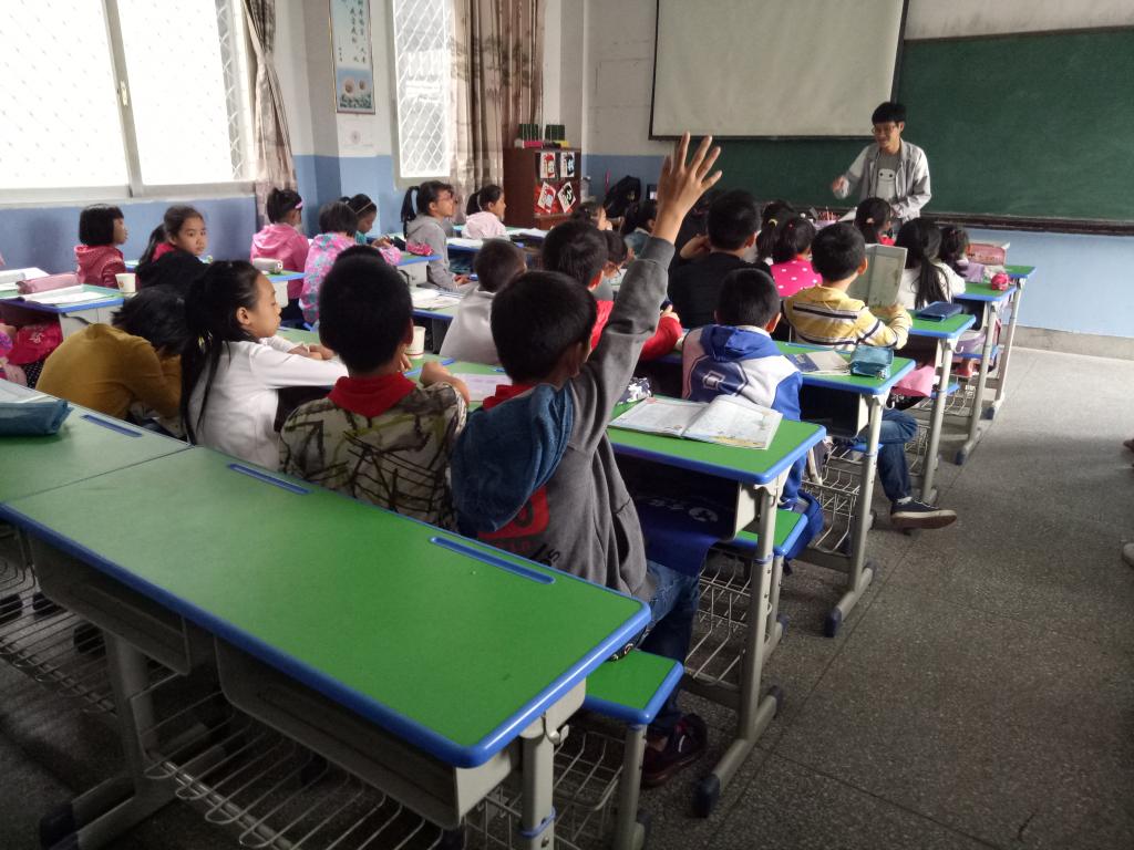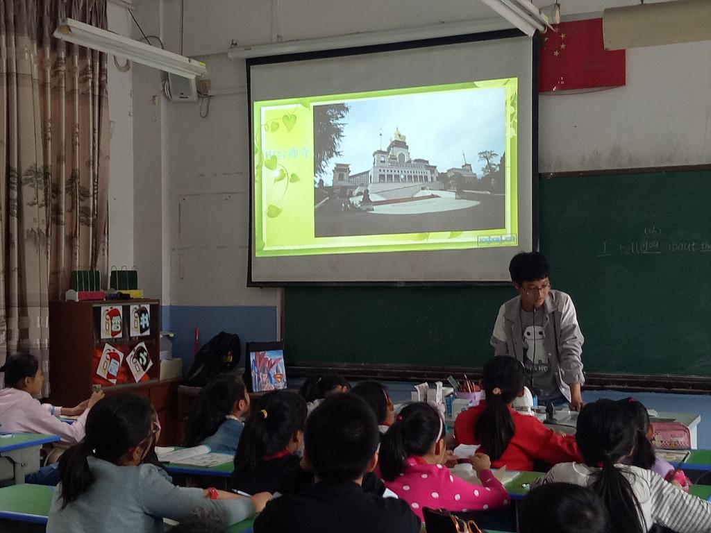 9点,支教志愿者开始授课。一位志愿者担任主讲,另一位担任助教。课堂上,志愿者让小朋友们对上周单词进行了复习,并以提问举手的方式让学生融入课堂。接着,志愿者们介绍了课本上所提及之地的风光,拓宽了学生的视野。课堂上还设置了许多有意思的环节,帮助小朋友们在欢乐的氛围中收获知识,并进行了基础语法的巩固。课堂氛围良好,学生积极活跃。