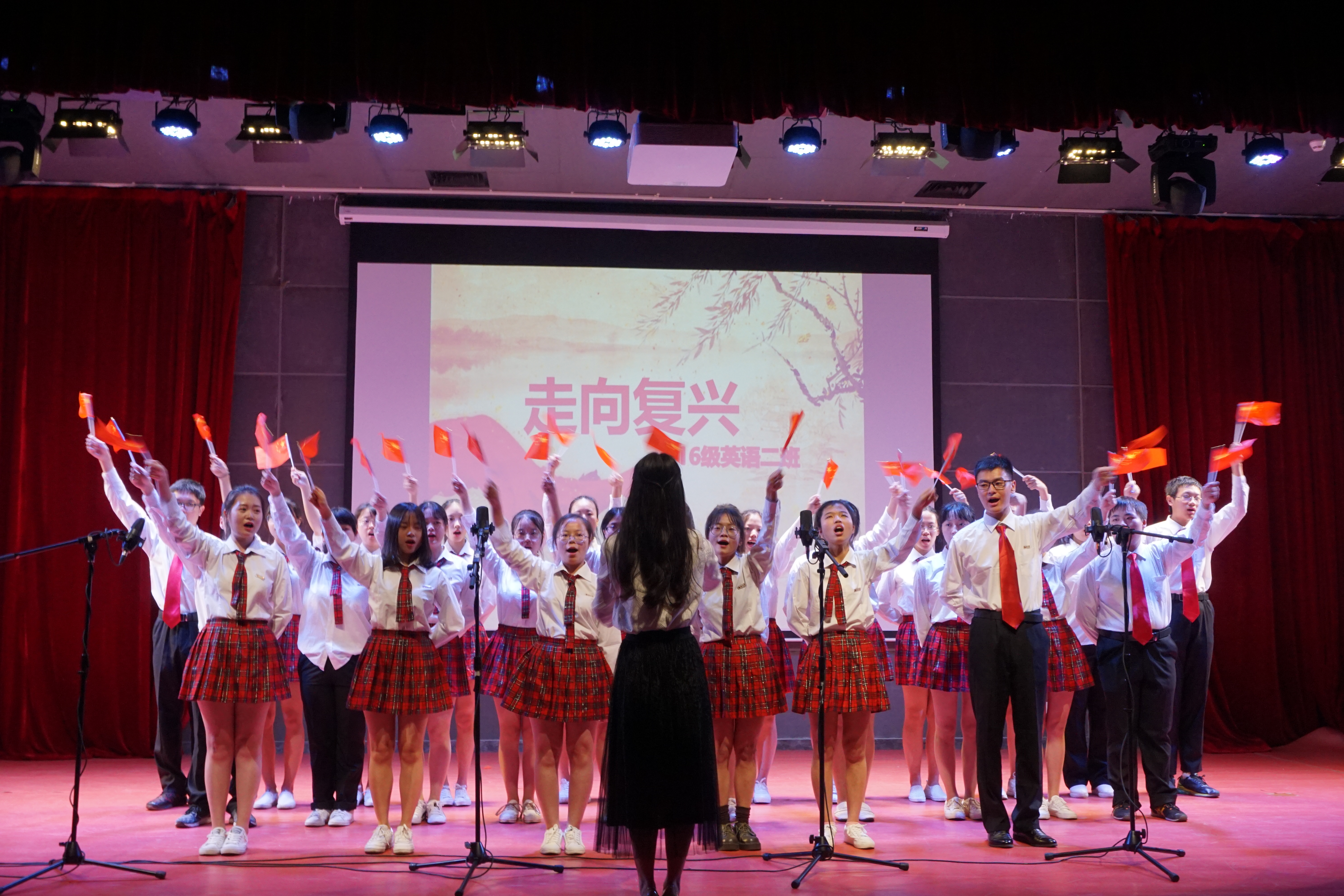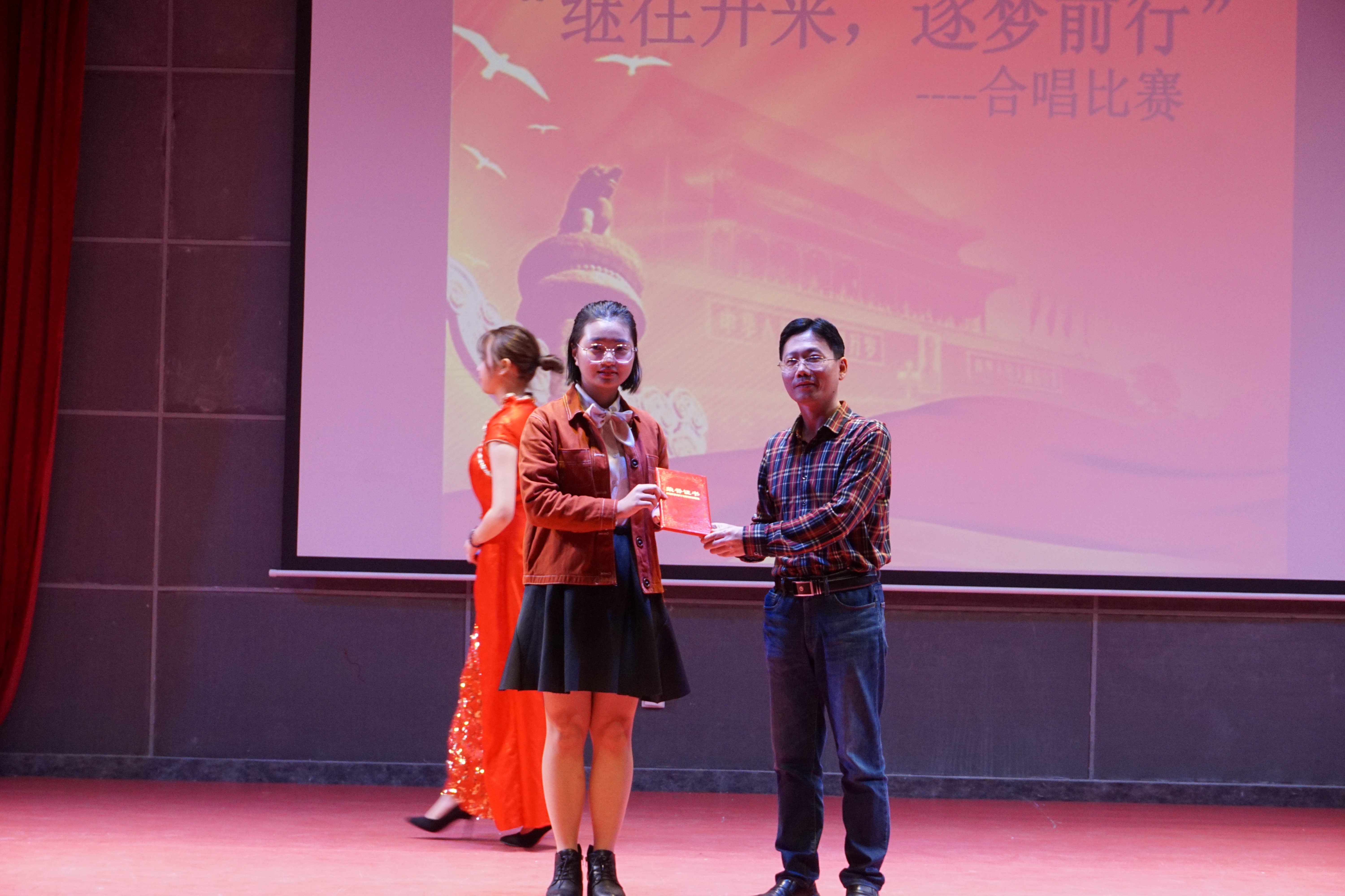 伴随着主持人娓娓道来的开场与介绍语,合唱比赛正式开始。首先上场的16级日语四班以一首自信昂扬的《我真的很不错》作为本次比赛的开场,高声呐喊着的“我真的很不错”,瞬间活跃了整场的氛围。身着朴素典雅的民国服饰,16级英语三班的学子们用歌唱与朗诵结合的方式为大家带来了两首耳熟能详的歌曲联唱《我的中国心》和《精忠报国》,热血沸腾的歌词与曲调令在场观众无不心潮澎湃。15级英语二班用一段精彩的Rap开始了他们的合唱曲目《相亲相爱》,可谓是极具创意,夺人眼球。17级英语三班充分利用自身英语专业的特点以中英联唱的形式演绎了经典曲目《友谊地久天长》,展现了了外院学子的深厚情谊。17级日语四班在流行曲目《没有什么不同》中融入了手语表演与深情独唱,以青春追梦人的形象诚意献礼党的十九大。最后出场的15级日语四班以一曲《没有共产党就没有新中国》展现了新一代青年对党和国家的自信和自豪,很好地契合了本次比赛的主题,为本次合唱比赛划下圆满的句号。