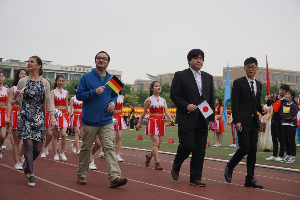 上午8时,在喧闹的田径场上,开幕式正式开始。伴随着激昂欢快的音乐,由学院代表队组成方阵,踏着整齐的步伐依次昂首步入会场,逐一接受领导检阅并献上开幕式表演。外国语学院代表队入场亮相。队列中各个同学身着青春亮丽的裙装,迈着矫健轻快的步伐,高喊冲震云宵的口号,,舞出了外院学子的精彩与活力。极具外院特色的太鼓队为大家带来了气势磅礴的太鼓表演,更是表明了外院学子将以着钢铁般的意志和精神,自信勇敢,团结合作,在此届校运赛场上争创佳绩的决心。表演结尾,队列同学展出了由中、英、日、德四种语言翻译而成的“激昂青春梦,领航新征程”,为展示外院特色锦上添花。巧妙的表演编排为全校师生带来了精彩的视觉感受,成为开幕式上一道绚丽的风景线。