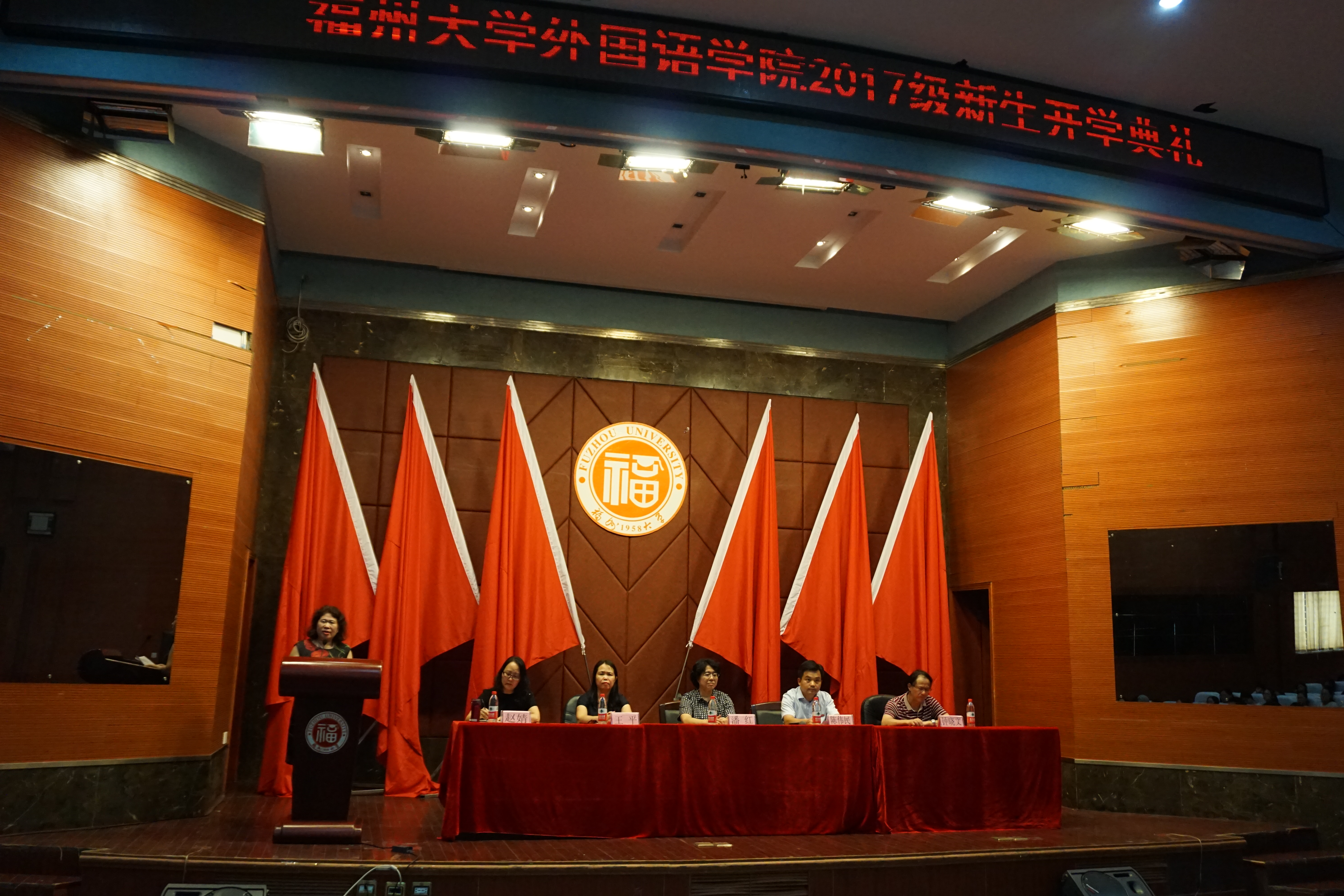 9月17日下午,外国语学院2017级新生开学典礼在嘉锡厅顺利举行。出席此次典礼的领导有外国语学院院长潘红教授、学院党委副书记(主持工作)陈伟民副研究员、副院长钟晓文教授、副院长王平副教授、院长助理赵婧副教授,各系主任与相关教师及2017级全体新生参加。