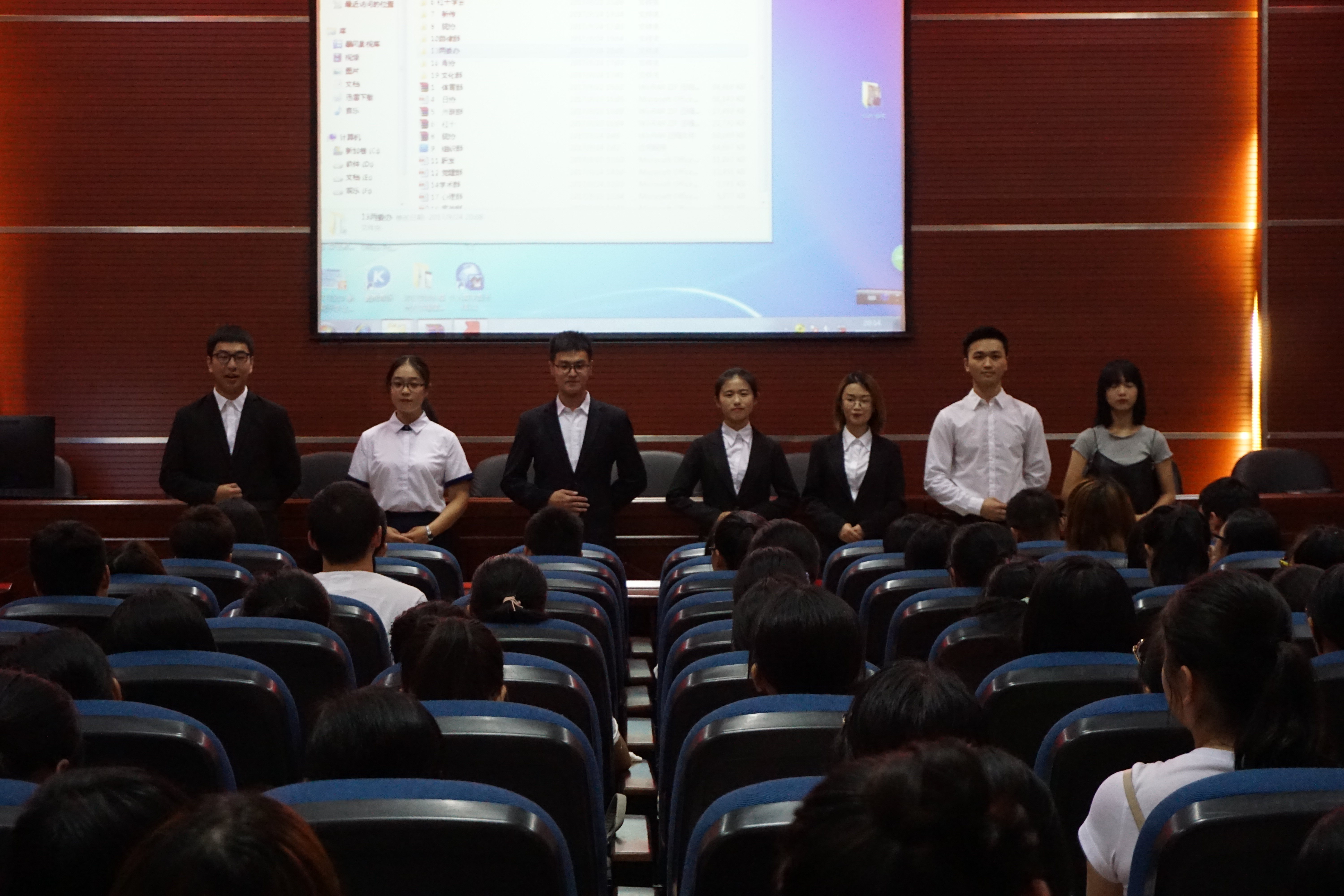 晚七时许,宣讲会准时开始。在主持人进行过各部门的简单介绍后,共19个部门的代表们按照宣讲会前抽签的顺序依次宣讲。宣讲人各出奇招,介绍了其所在部门的职能、活动以及福利等,让新生们对于学院团委学生会有了一个更加全面、系统、具体和深刻的了解,鼓励同学们积极加入学生会,融入大学生活。在演示文稿的配合下,新生们逐渐了解了各部门。