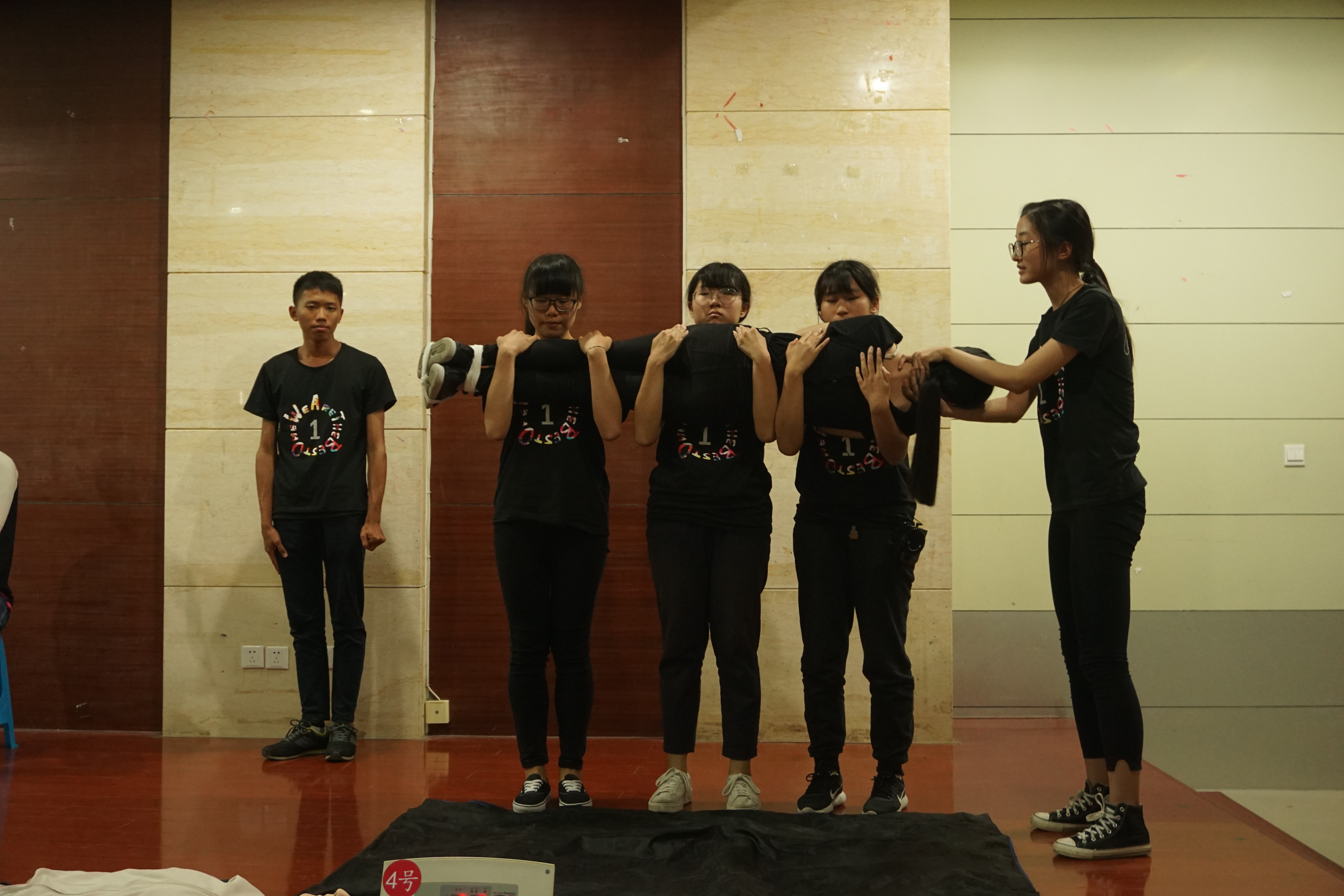 经过初赛的激烈角逐,共有9个学院的队伍成功晋级决赛,外国语学院的队伍名列其中。比赛开始前,在工作人员的安排下,参赛队员和观众有序入场并按照学院进行入座。大赛共分为三个环节。首先是各学院的风采展示。参赛队伍各出花样,向评委嘉宾和观众们介绍自己的队员。接下来是考验选手们理论知识的问答环节。每队派出三名队员应对主持人的问答。其中,来自生工学院的队员零失误、快速地完成所有问答,赢得台下观众的叫好声。最后是紧张刺激的模拟急救环节。助手们搬上假人道具,模特们则端正地坐在椅子上。大屏幕上显示出各种灾害情景,参赛选手须对伤员进行伤势判断并实施急救。队员们有的做心肺复苏,有的对伤员进行包扎,有的进行徒手搬运,科学分工,临危不乱。