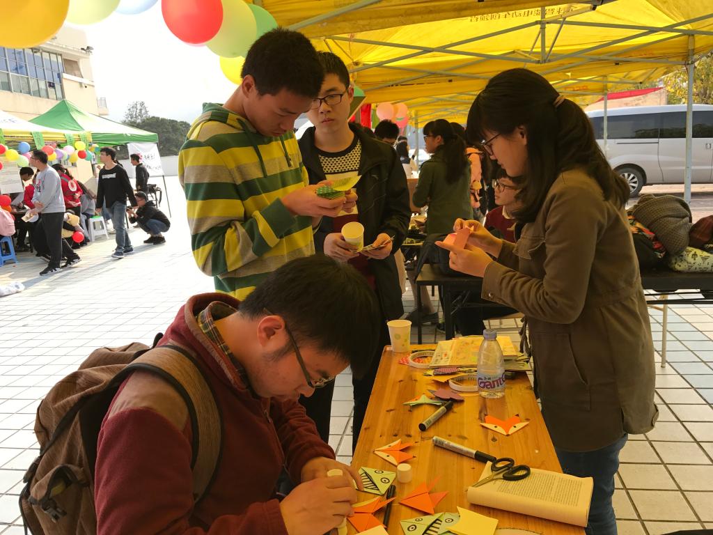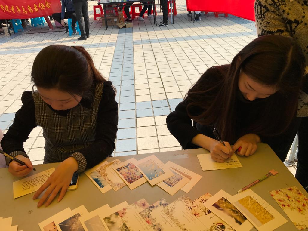 14时,志愿者协会的同学们到达青春广场,活动正式开始。活动共分为两部分,其一是“卡通书签DIY”,志愿者们向来往的同学们教授折纸,同学们折好的书签将作为礼物送给美岐小学的小朋友,为他们送上一份爱心;其二是“寄给你的一封信”,同学们提笔写下自己想说的话,青年志愿者协会的同学们则化身信使,为同学们传递一份真情。活动过程中,不断有同学前来写信及学习折纸,志愿者们耐心地教授,也在第一时间将信件送到收信人的手中。17时左右,活动圆满结束。