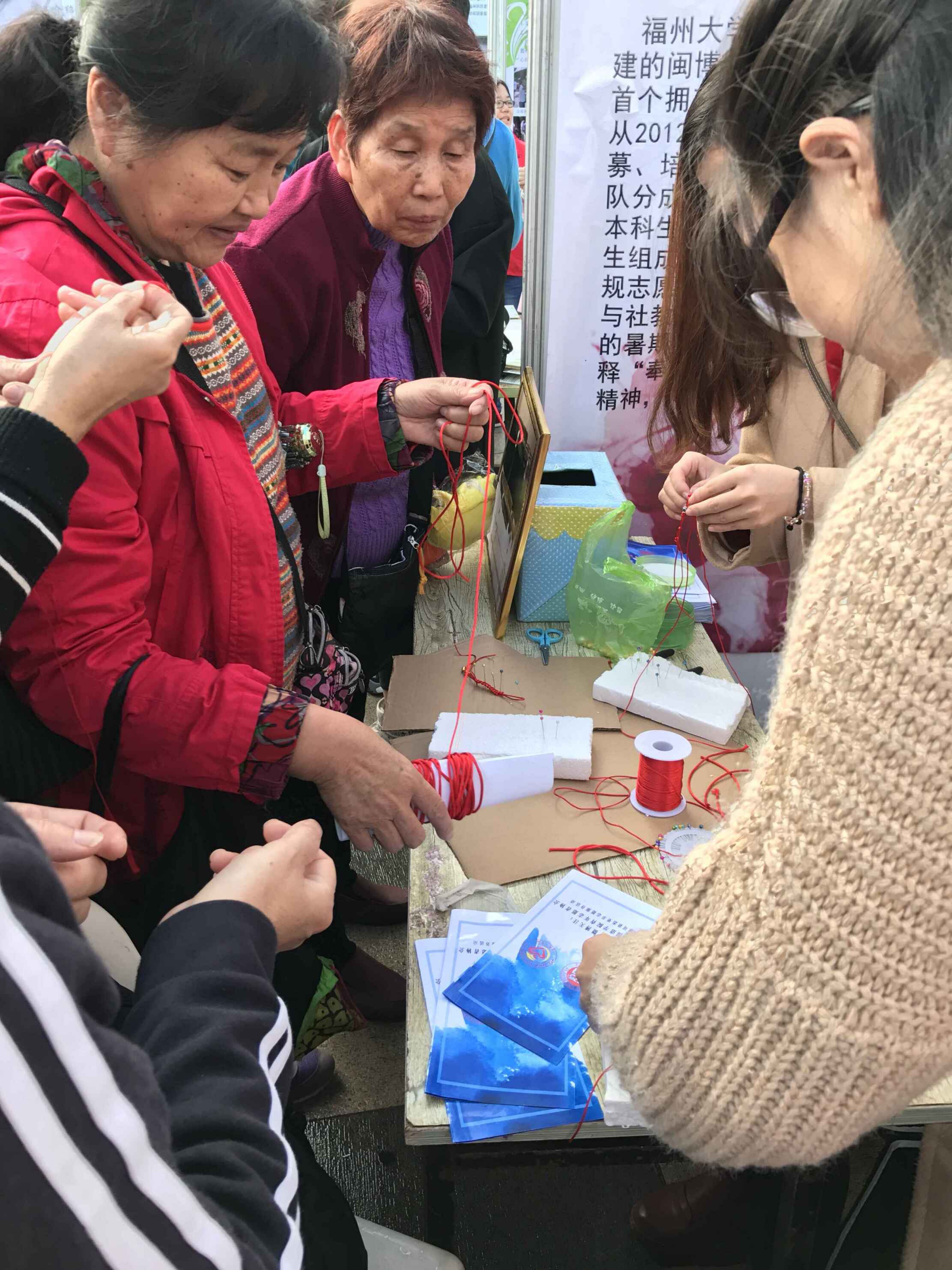 此次外院青协进行的活动有“闽博志愿服务讲解”和“创意编绳教学”。讲解项目中,志愿者以“西周越式青铜剑”为例,采用中英双语讲解,游客们纷纷竖起大拇指表示赞许。编绳教学中,以中国结和手绳为主的样品受到极大的欢迎。志愿者在现场展示了创意编绳的教法,吸引了众多游客。虽然当天上午天气变化不定,时晴时雨,但志愿者们仍干劲十足,力求为志愿服务活动尽到自己的力量。