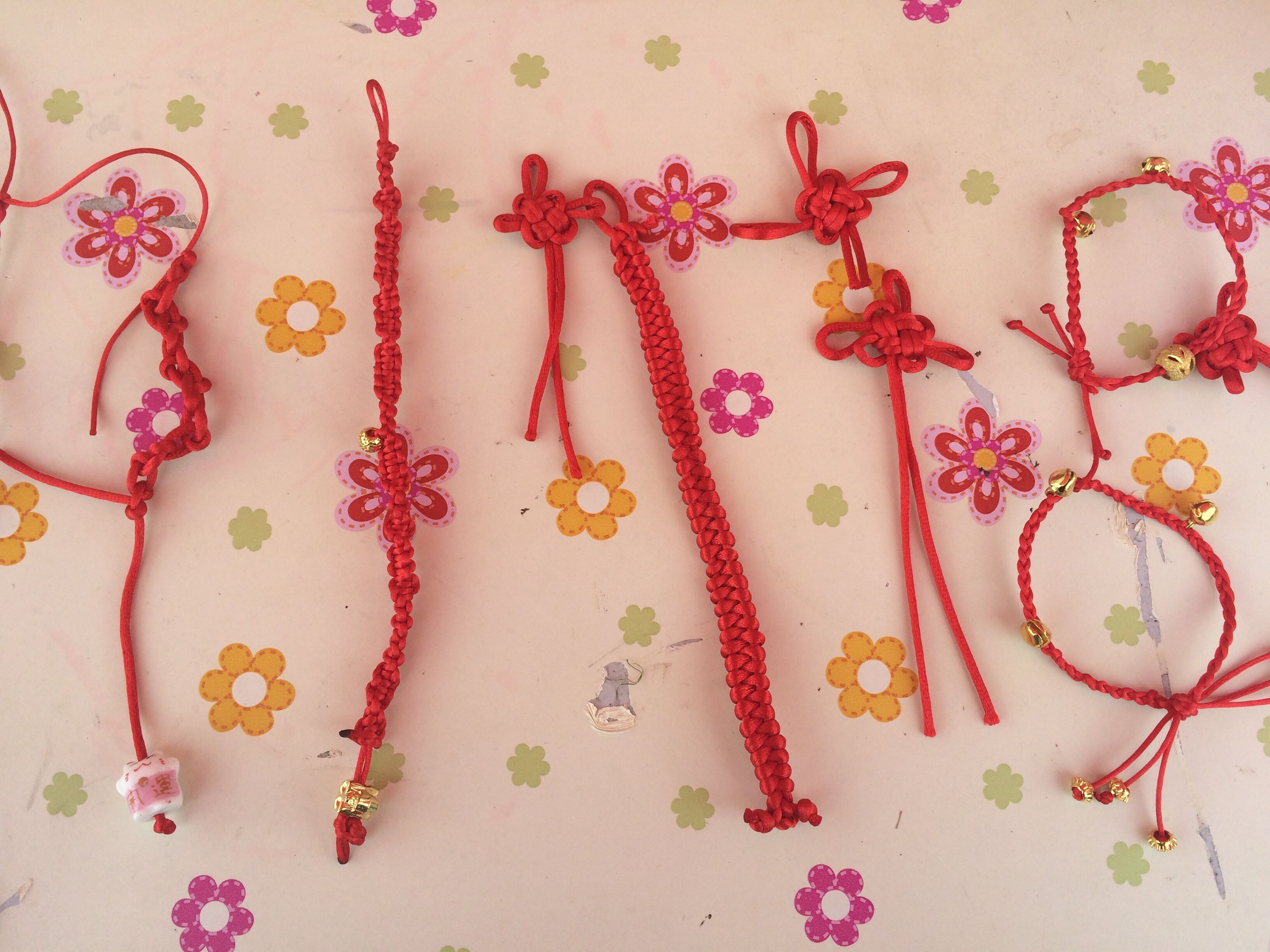帐篷内,志愿者们摆起成品。一条条精美的手绳,一个个精致的中国结惹来行人们的驻足观看。有的人跃跃欲试,拿起红绳开始编织。志愿者们先给初学者们口头讲述编织手绳的步骤,之后手把手教学:先打一个结,接着绕过来,扭过去,将小饰品穿进绳中后重复之前的动作,一条手绳就制作完毕了。初学者认真地练习,志愿者耐心地为他们回答疑惑之处。细绳在技术娴熟的同学手中“旋转、跳跃”,三下五除二,一条手绳便成型了。围观的人们都投来羡慕的眼神。紧接着,志愿者们开始教大家如何编织中国结。先裁一段红绳,丈量出挂耳长度后再用钩针固定,绕圈、联结。编织难度大,有的同学皱着眉头,有的认真思索,有的焦急询问……在志愿者的帮助下,同学们编好了自己的中国结。