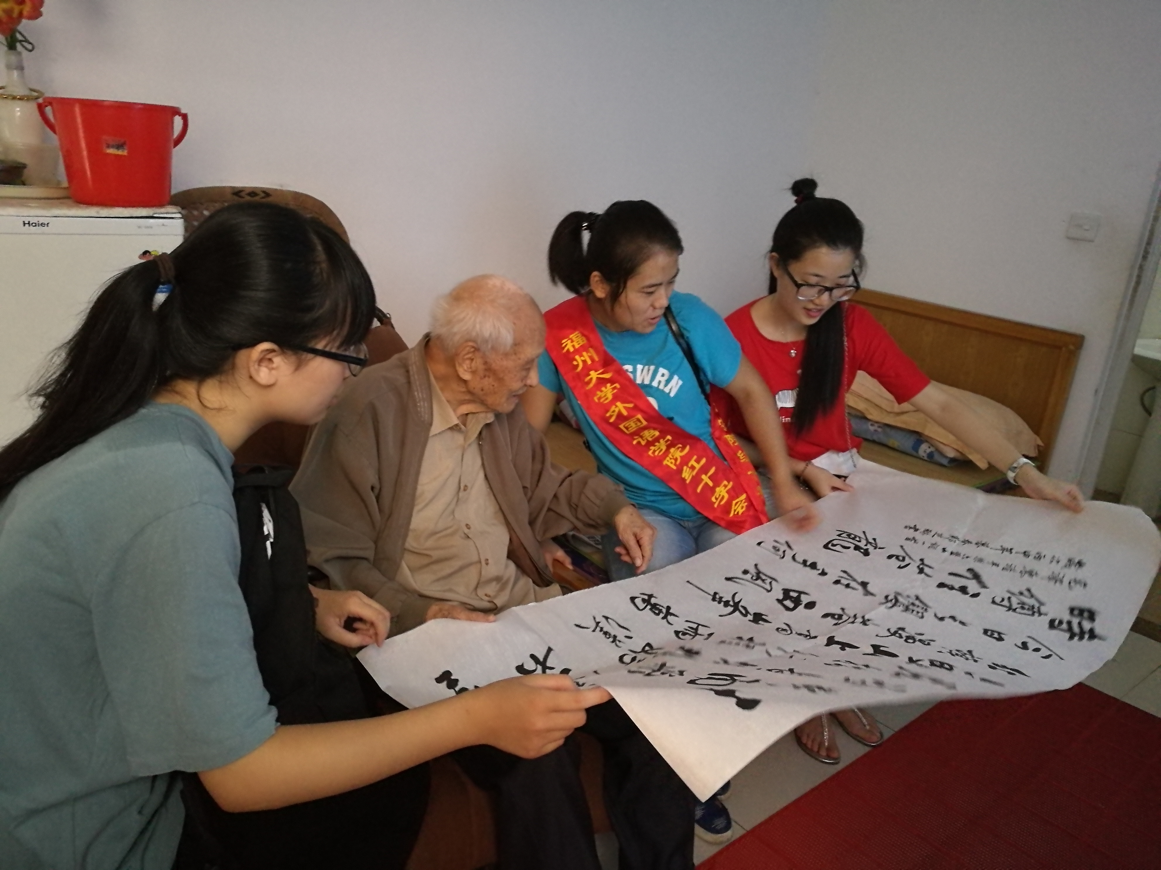 在聊天过程中,一位年过九十的抗战老人的故事深深地吸引了同学们。他曾是大连一所学校的校长并教授语文,在抗美援朝时与学校的学生们一起参军。而今,老人讲起这段往事眼睛炯炯有神,令同学们为之动容。在最后,同学将自己手写的毛主席诗词《六盘山》书法作品送给老人,老人激动地握着同学们的手,念出了其中“不到长城非好汉”的诗句,同时鼓励同学们要好好学习,努力提高自身文化修养,为国争光。