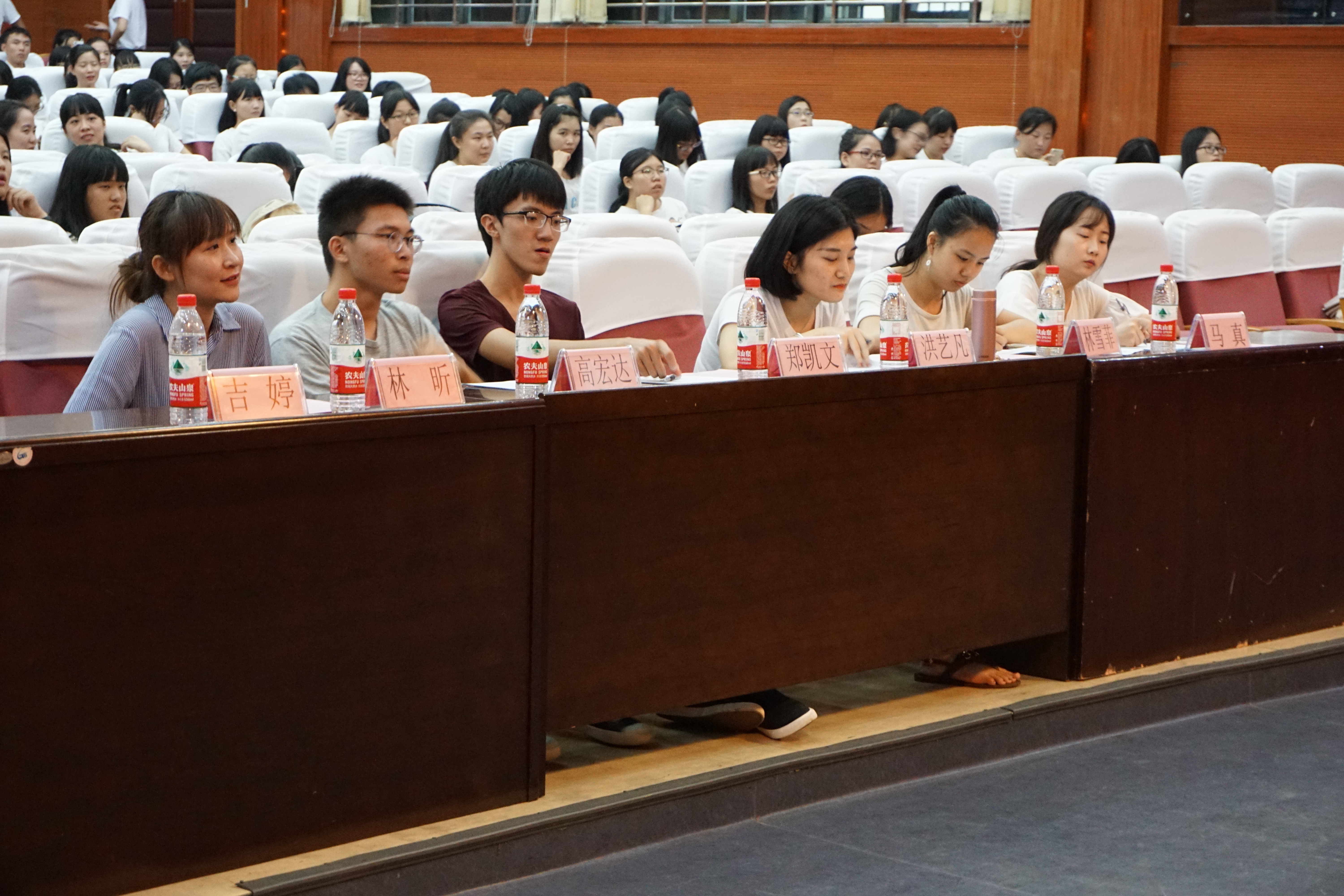 本次比赛共有自外国语学院14-16三个年段的15个班级参加。各参赛班级身着整洁统一的服装,在主持人的介绍下迅速有序地入场。他们用宏亮的歌声唱出对祖国的热爱,用别出心裁的表现方式表达心中深切的渴望,或是将诗朗诵与合唱结合,或是巧妙地把舞台剧穿插于合唱中,或是添加入动人的民乐演奏,各有亮点,精彩绝伦。同学们满怀对未来的憧憬和对梦想的期待,使出了“洪荒之力”,将过去两个多星期的排练成果极尽完美地献给观众。在指挥的引导下,同学们准确掌握歌唱的节奏。欢快的歌声不绝如缕,余音绕梁。一首首革命红歌展现了展现了外国语学院院莘莘学子良好的精神风貌。听众们也不禁为台上同学们的精彩表现献出热烈的掌声。各评委以公平、公正、公开的态度对参赛班级的演唱进行评分。
