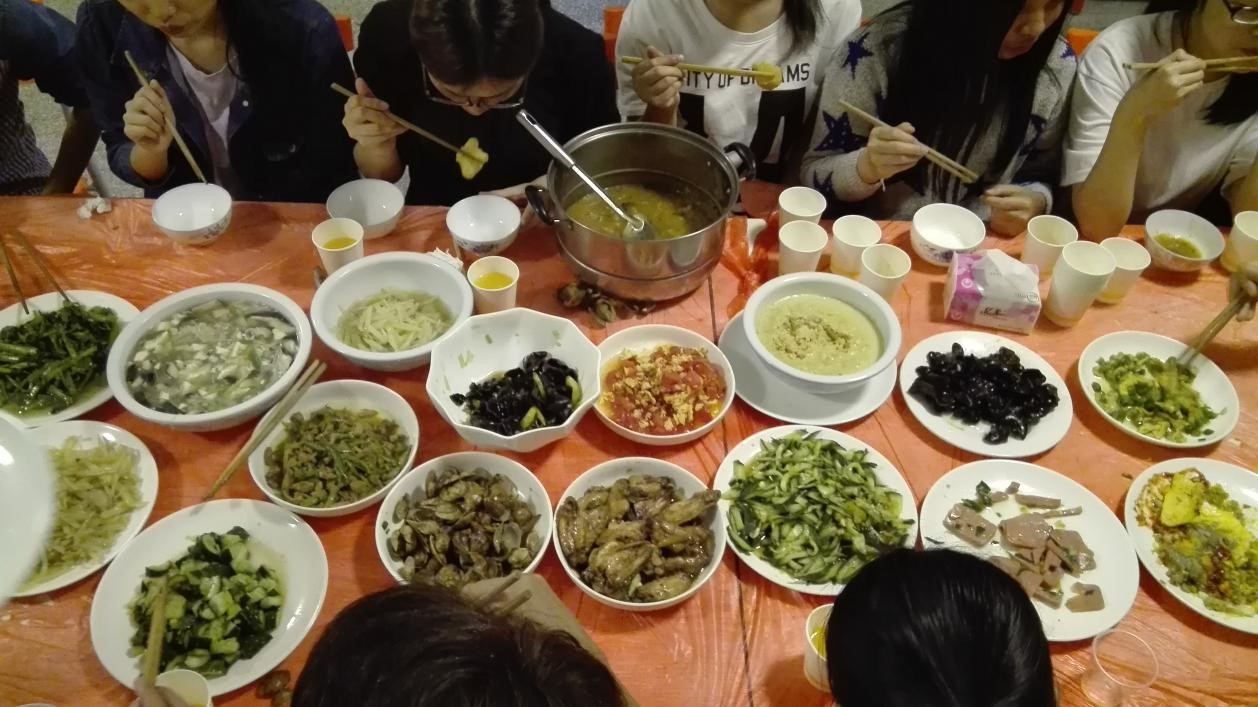 下午两点,部分团员先到超市进行食材采购,另一部分同学到达厨房进行餐具厨具准备工作。紧接着就是紧密有序的烹饪前期准备,团支部成员分工明确、彼此配合,处理食材、调料准备、厨具准备等工作有条不紊地进行。到了美食烹饪时间,大家各施所长,相互帮助,一起开动。有闽南的海蛎煎、北方的胡辣汤、福州鱼丸与肉燕等家乡菜,还有系列家常菜青椒肉丝、可乐鸡翅、酸辣土豆丝、西红柿炒鸡蛋……在一阵忙碌与欢笑后,所有美食全部完工。大家围坐一起,品尝劳动成果的同时,分享独具特色的美食文化,其乐融融。