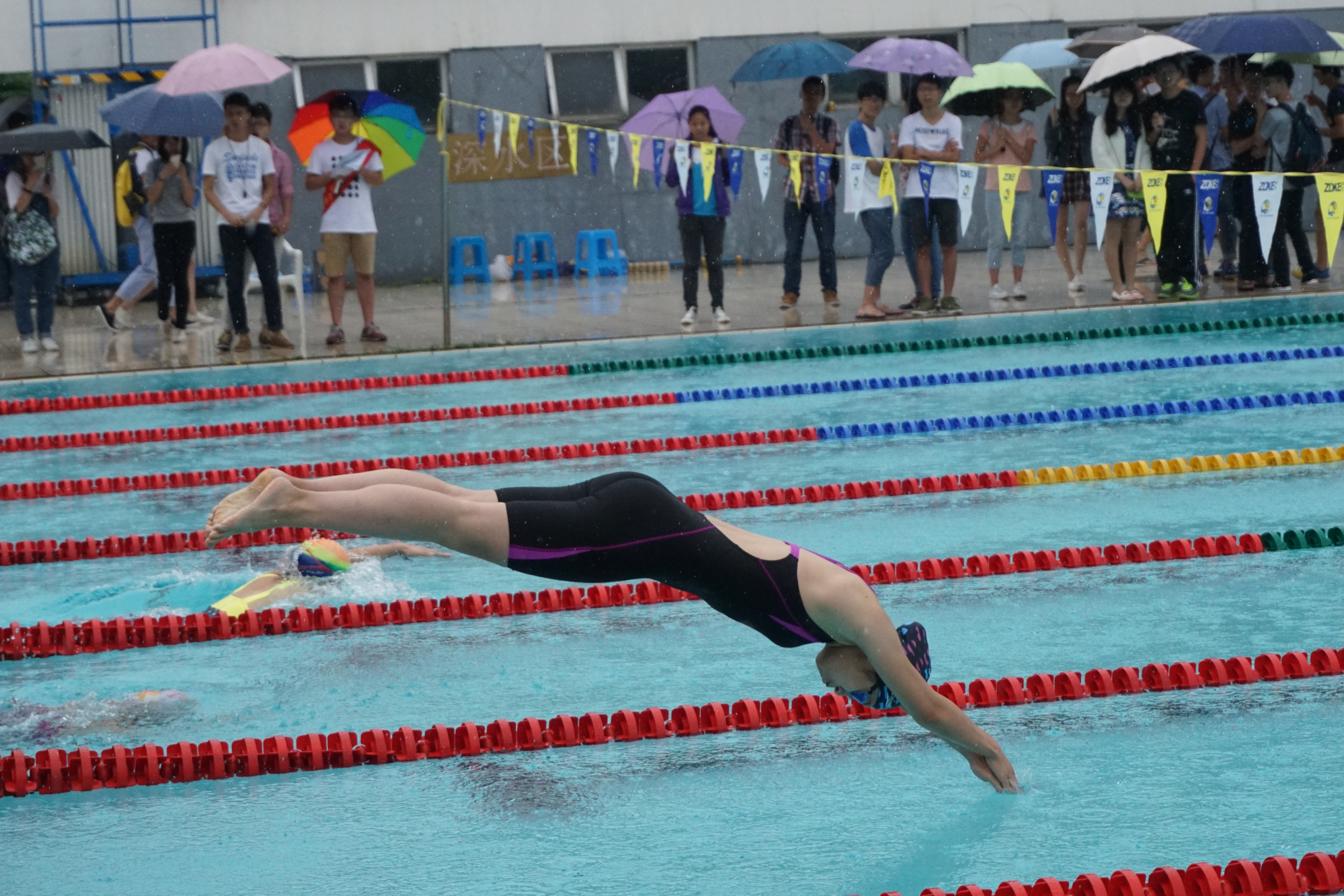 比赛当天正逢雨水天气,气温较低,但是参赛运动员依旧斗志高扬,在场观众也是热情洋溢。上午9时,50米蛙泳、100米自由泳比赛正式开始,来自各学院的游泳健将们在泳池中一较高低。下午2时,100米蛙泳、200米个人混合泳、4*50米混合泳接力比赛依次拉开帷幕。比赛现场氛围热烈,各院参赛队伍同场竞技,互相较量,水上竞技花样之多也是让人目不暇接。