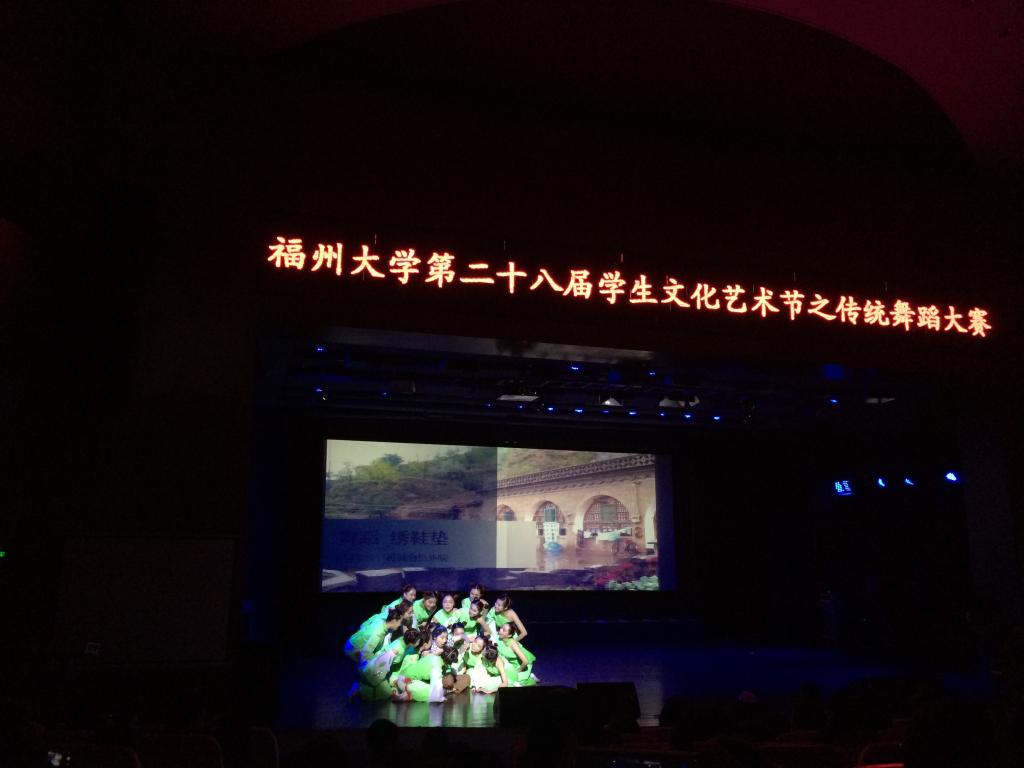 比赛还未开始,各学院舞蹈参赛者已经身着各式各样的传统服装在现场准备就绪,少见的传统服装让观众们不住地向参赛者们投去好奇的目光。由海洋学院学生带来的《缅桂花开朵朵香》拉开了本场舞蹈比赛的神秘帷幕,外国语学院、物理信息学院、机械学院的学生合作的参赛节目《绣鞋垫》第六个出场,《绣鞋垫》以整齐的舞步,巧妙的动作完美地展现了土家民族风情。绣鞋垫是我国土家儿女定情及传递友谊的一种方式,而随着现代文明的发展,这一具有民族个性的手工艺术正在被现代文明的潮流所淹没,这段舞蹈呼吁我们要继续发扬和继承这一悠久的历史文化,同时也向我们展示了绣鞋垫的场景,以及这个鞋垫所寄托绣鞋垫人怎样的一种情思。比赛现场气氛十分浓烈,掌声和欢呼声几乎没有中断。现场座无虚席,很多观众因为没有位置直接坐在过道阶梯观看了整场比赛。这场舞蹈的视觉盛宴极大地满足了观众们的视觉享受需求。