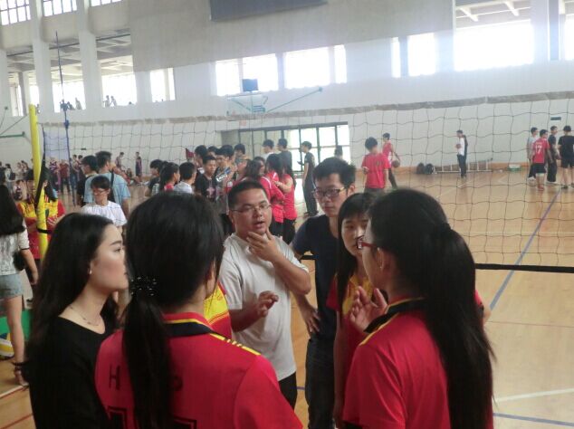 一声哨响,比赛开始。大概是刚刚开场带有些紧张的情绪,队员们有点配合失误,比分稍稍落后,几次发球与配合失误让观众们看得可惜。为了调整队员情绪,积极应战,中场教练要求休息一次,为队员们做战术分析并鼓励打气,而前排球队队长也特地前来为后辈们加油鼓劲。随后,队员们的状态愈佳,第一局比分一度胶着,终以21比20胜利。第二局开始,队员们愈战愈勇,士气高涨,比分大幅度领先,给对手造成了压力,终以21比12的压倒性优势获胜,并摘得首场的胜利。