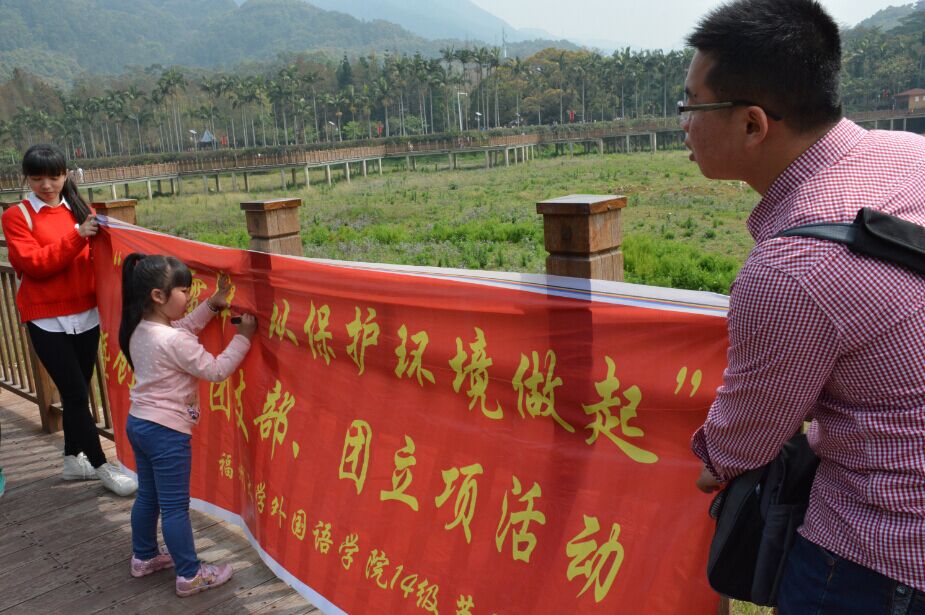 最近柴静的“穹顶之下”在网络上掀起了一阵“同呼吸,共命运”的保护环境热潮,英语四班的同学们以这个话题作为切入点,深入了解“穹顶之下”在现实生活中是否也被人们所熟知。经过采访了解到还是有很多人没有看过“穹顶之下”。对于那些没有看过视频的游客,英语四班团支部的同学们给他们介绍了视频重点内容并建议他们有时间可以去看一看。另外有一部分人则表示看过视频并且深有感触。其中有一位游客表示虽然福州的空气质量在全国城市排名中还算靠前,可是也要树立保护环境的意识,要真正做到防患于未然。而有些游客则表示自己在生活中也很注意环保,比如路程不远的出行尽量以步代车。在采访过程中,英语四班的同学们则邀请过往游客在横幅上签名,以此来表达自己要为保护环境尽一份力的决心。宣传活动的过程中,还有很多家长让自己的小孩子来签名并现场教育他们要保护环境。