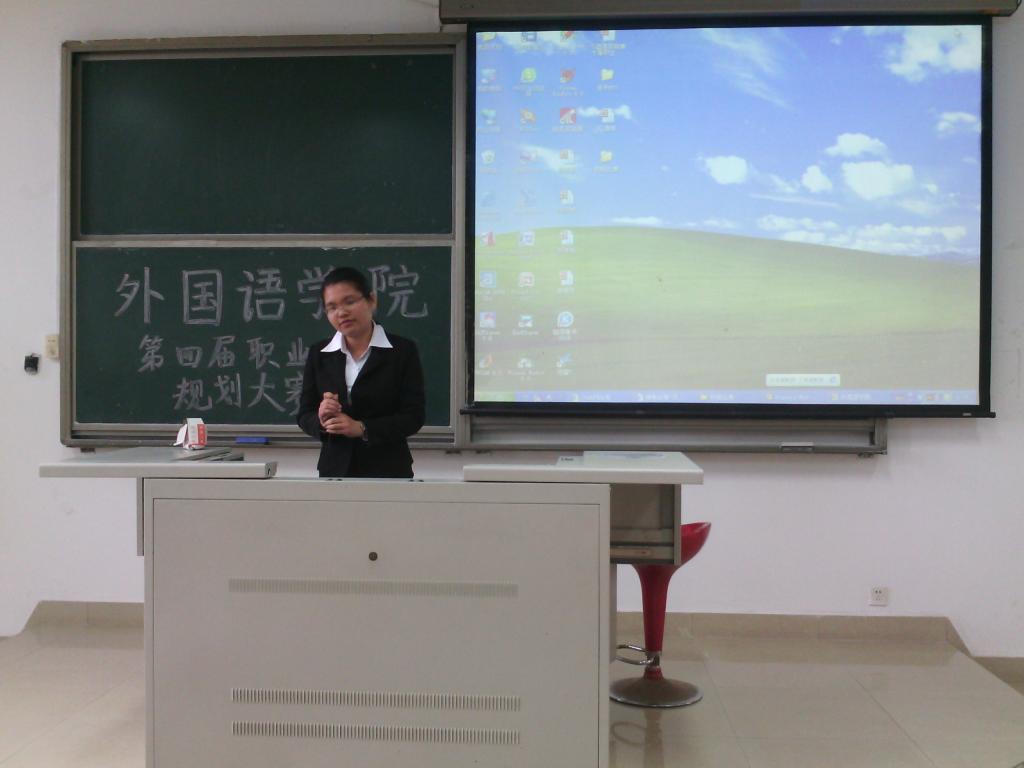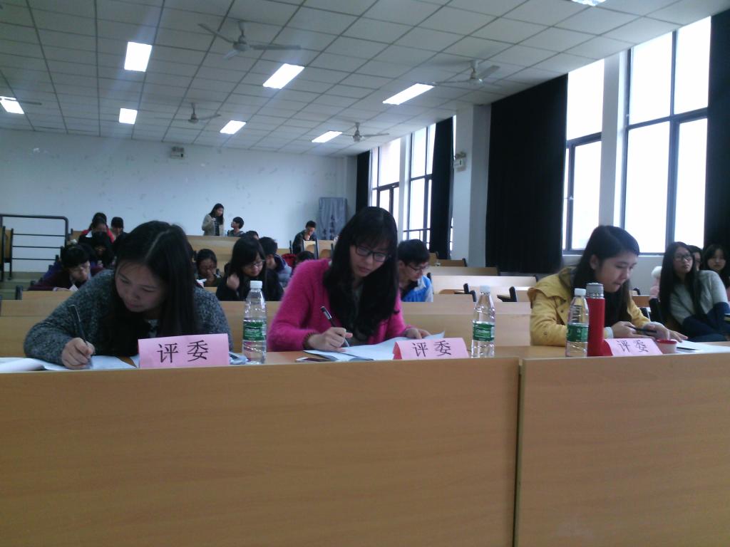 上午九时,在主持人简略介绍比赛流程与规则之后,比赛正式开始。比赛要求每位选手将演讲时间控制在10分钟之内,包括8分钟的PPT展示和2分钟的评委提问。第一位选手吴艳芳结合自己的实际和各类测评结果,对未来的职业发展做出了自己的分析;第二位选手日语系的江德琳同样是将自己的现实评价和测评建议相结合,为自己设定了明确的未来发展目标;第三位选手郑琳艳以自己的名字为引对比中外文化,向观众讲述了自己的翻译理想;第四位选手英语系大三学生杨丽婷有着金字塔般的目标设定,PPT简洁明了同时叙述冷静流畅;第五位选手苏小云从自己的兴趣出发来规划自己的职业,目标明确且为之制定了一系列的行动计划;最后一位选手赵可欣的职业目标是同声传译,她综合分析了自身的能力发展和当今就业形势,自信而谦逊。六位选手演讲完毕后,在评委们进行最后评分的同时,活动进入中场互动环节,一直严肃的气氛慢慢得到舒缓。在公布最终结果之前,刘文婷老师对六位选手的表现依次作了点评并且提出了很多有益的建议。最终的比赛结果如下:一等奖:赵可欣,二等奖:郑琳艳和杨丽婷,三等奖:苏小云、吴艳芳和江德琳。