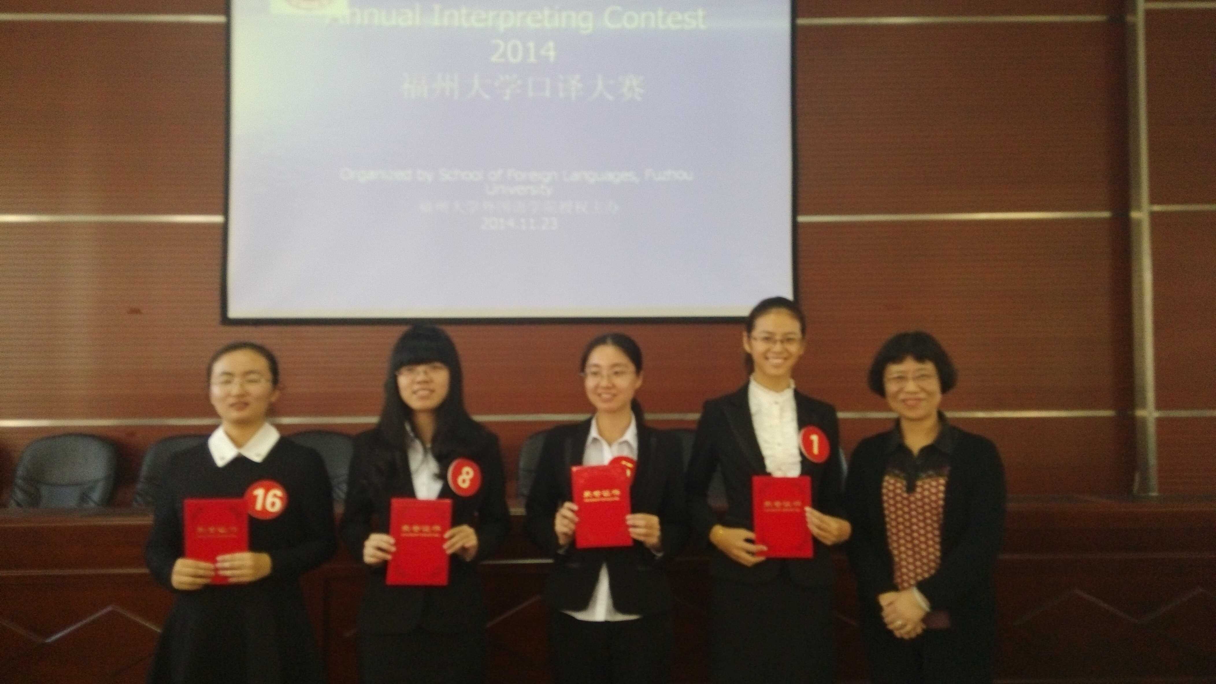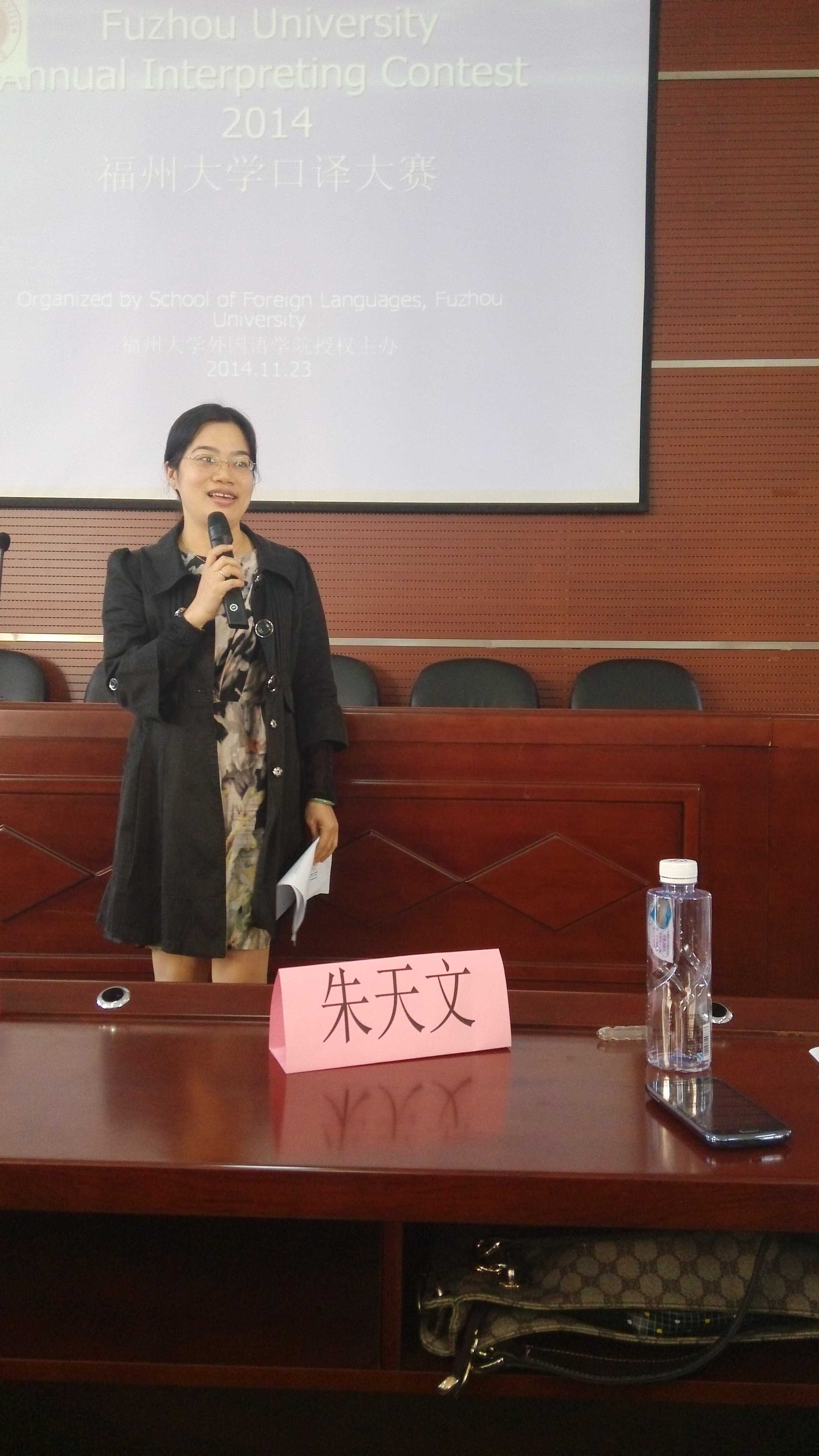 英语口译大赛在外国语学院大会议室举行,担任本次比赛的评委有钟晓文副院长、陈小慰教授、朱天文、王振南,由叶长缨副教授和院长助理林继红两位老师负责比赛文稿的朗读。