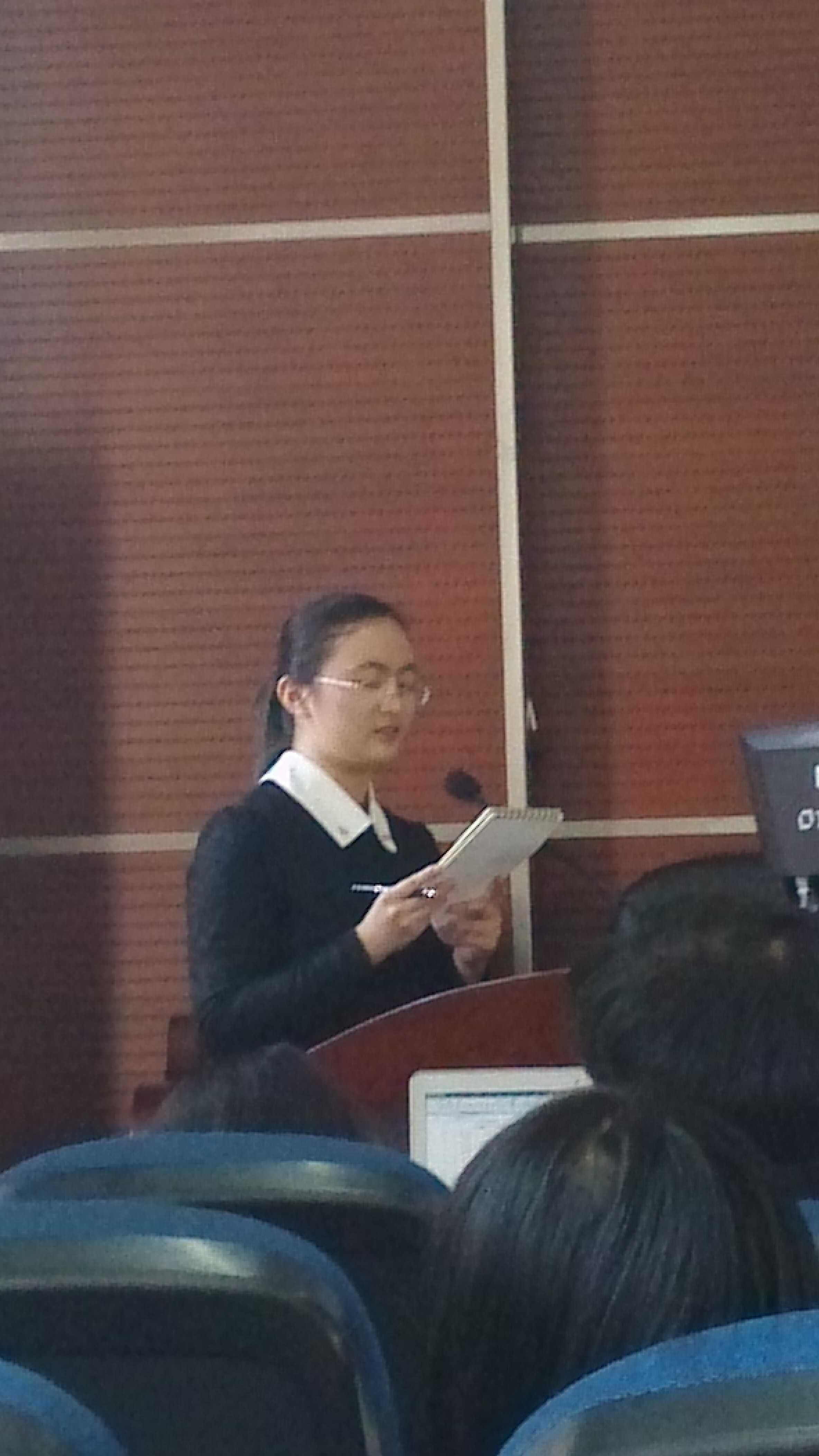 首先进行的是英译汉的初赛,比赛前每位选手将被提供写有专业名词与英文背景的提示小纸条。比赛开始时,先由老师分两次朗读一段英文,要求选手在老师停顿处将其翻译为中文,还未比赛的同学在侯考室等候。选手们奋笔疾书,生怕漏掉某个细节,同时又快速地在脑海中寻找最贴切的词语以符合语境、语义,再根据中文与英文表达习惯的不同,迅速地调整句子的结构,最终用流利的中文将选段翻译出来。在老师抑扬顿挫的英文朗诵和选手笔尖飞速划过纸面的沙沙声中时间飞逝。