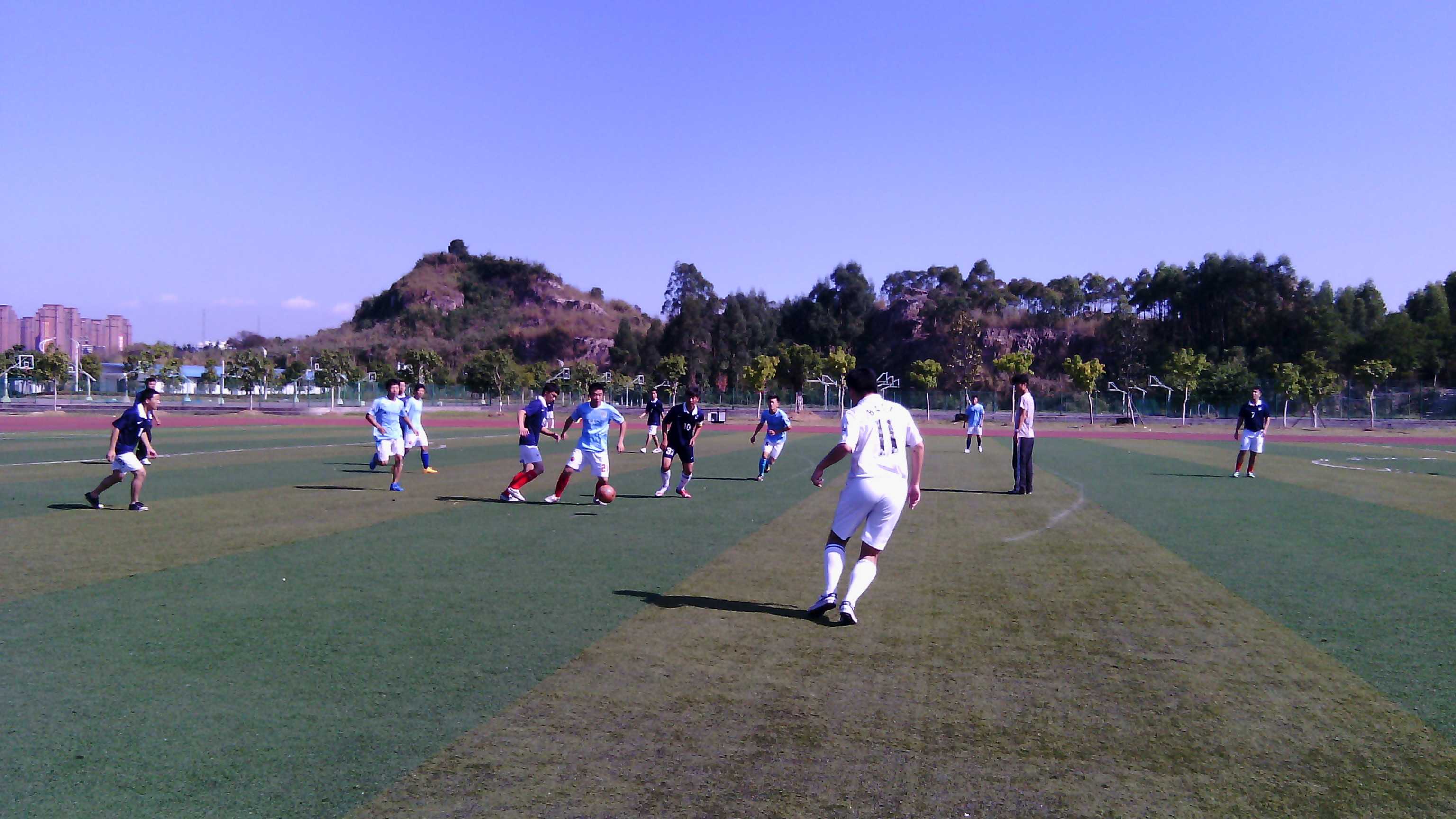 尽管现在已是11月中旬,但是今天的温度仍然比较高,而且足球赛又是在中午进行,不过足球队队员丝毫没有受突增的温度影响,依旧热情高涨。负责踢球的球员互相配合,带着球在足球场上尽情奔跑,每一次进球后都能听到队员们大喊的一声“好”,鼓舞人心;守门员则全神贯注地守在球框前,认真地观察着赛况,随时准备出手;裁判员的眼睛紧随着球员移动,为他们判断是非胜负。虽然最后外国语学院与胜利失之交臂,但是秉持着“友谊第一,比赛第二”的原则,赛后友好地与建筑学院足球队队员握手。