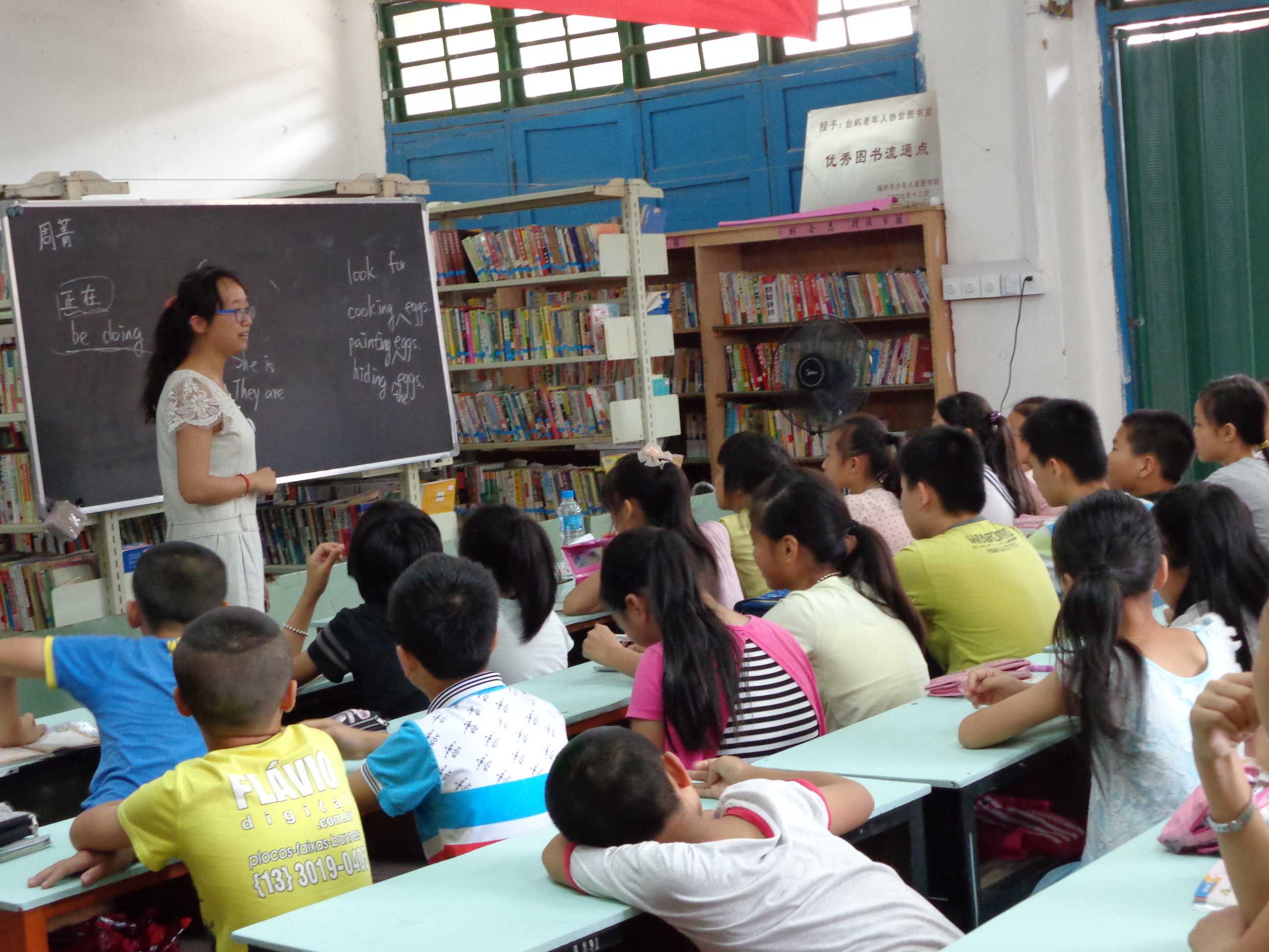 6月26日上午8点20分,外国语学院青年志愿者协会成员以及今天的英语辅导志愿者们来到仓山区台屿农家书屋,开展第二天的“语凝书屋,梦圆今夏”农家书屋暑期社会实践的活动。8点40分,“大手拉小手,快乐学英语”暑期英语辅导活动正式开始。