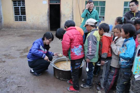 点半起床后,在志愿者们的带领下进行晨读、晨跑早自习、早餐与上午课程,下午的安排是为校园文化艺术节做的表演做准备,在晚饭过后便是晚自习,一天的课程便告一段落。虽然生活与学习条件比较艰苦,但孩子们的单纯善良、乐观好学却让志愿者们感动不已。孩子们对志愿者的信任也让志愿者们全情投入于教学与关心孩子生活点滴的细节中,温情在师生间传递。
