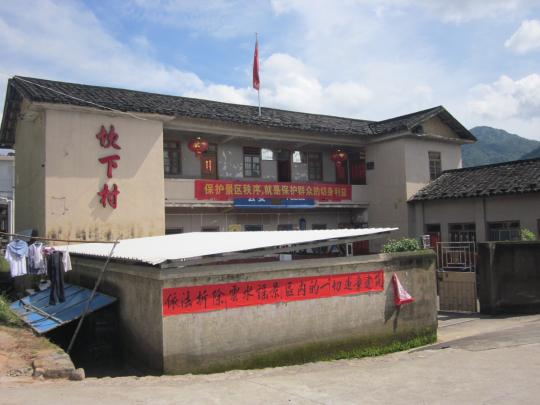 来到坎下村接待处,同学们有幸见到这里的村长和村支书。在同学们进行自我介绍和说明来访意图后,村长热情地泡茶款待他们。茶香弥漫之际,村长慢慢地跟同学们介绍起云水谣古镇。根据他的阐述,云水谣古镇原名长教村,全村只有唯一的一个姓氏——简。古镇居民之前一直以种茶为主,近几年旅游业大力发展,古镇的产业结构迅速升级,从发展主要第一产业过渡到着力发展第三产业。虽然村民们的生活水平提高了,但大家也不忘对云水谣古镇的保护。就此,村长向同学们介绍有关云水谣古镇的保护现状以及政府采取的保护措施,并且透露古镇未来的保护性发展计划。坎下村的领导们没有因为同学们是学生而马虎敷衍,而是十分耐心地回答采访问题,对同学们不了解的地方还做详细的解释。同学们被他们的热情好客深深打动,采访结束后即邀请领导们合影留念。