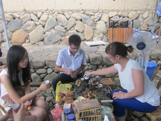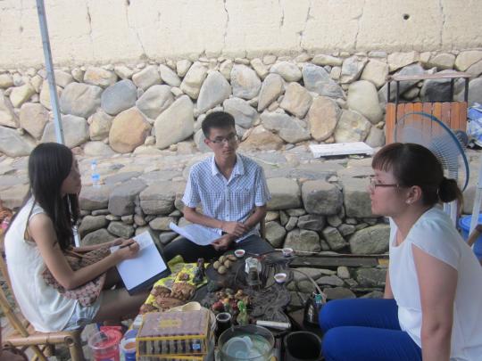 外国语学院12级英语4班的同学们继续深入采访。今天,同学们的采访对象是当地卖土楼纪念品的简阿姨。