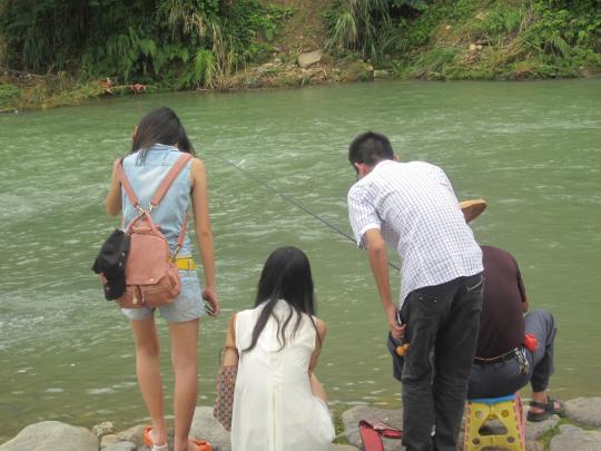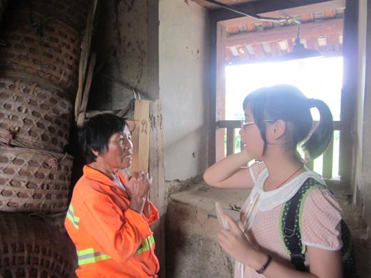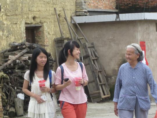 外国语学院12级英语4班的同学们继续走访云水谣古镇的居民区。今天,同学们分组展开行动,从旅店主人到路上友善的老奶奶,从当地的保洁阿姨到钓鱼老翁,同学们争取更多机会与当地居民交谈,从而进一步了解云水谣古镇的发展历程及其保护现状。其中,最让同学们印象深刻的是一名在路上偶遇的老奶奶。