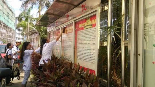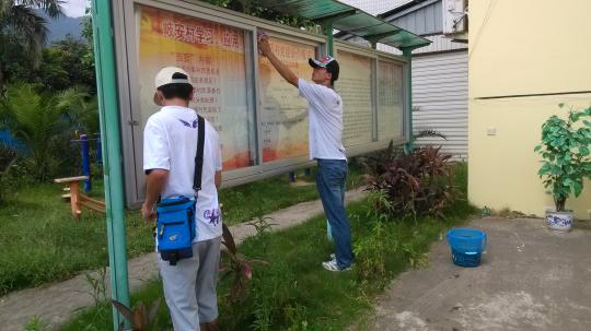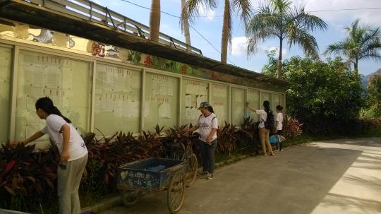 外国语学院12级英二绿团的12个队员们到达歧安村,开始了第三天的暑期实践活动。他们此行的目的是清洗歧安村的宣传栏,让党的精神和农村精神更加鲜明。与村长沟通好后,在村长的带领下,来到了宣传栏前。虽然烈日炎炎,但是丝毫不减队员们的热情。在大家的合力努力下,经过一个多小时的清扫,宣传栏焕然一新。清洗完成后,队员们还兴致勃勃地向村民们介绍了宣传栏里面的相关知识,进一步促进了村民们对党和国家有关政策的认识。