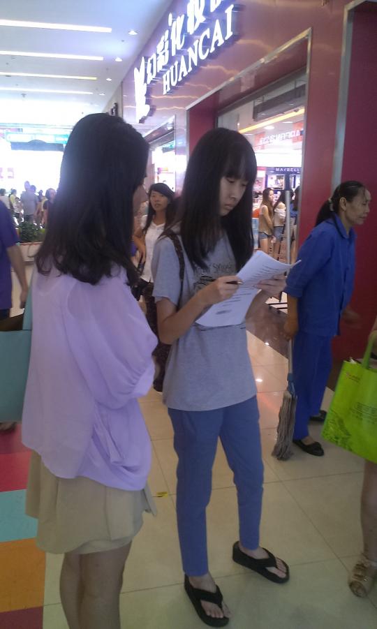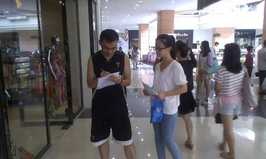 月18日下午,由4名成员组成的外国语学院2012级英语三班暑期实践小组于福州宝龙城市广场开展暑期社会实践“